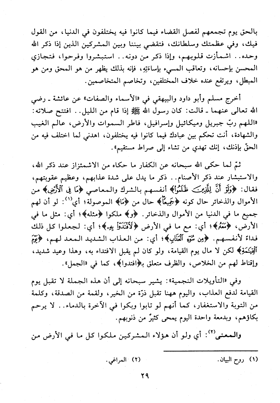 47 - ثمّ لما حكى الله سبحانه عن الكفار ما حكاه من الاشمئزاز عند ذكر الله، والاستبشار عند ذكر الأصنام .. ذكر ما يدل على شدة عذابهم، وعظيم عقوبتهم، فقال: {وَلَوْ أَنَّ لِلَّذِينَ ظَلَمُوا} أنفسهم بالشرك والمعاصي {مَا فِي الْأَرْضِ} من الأموال والذخائر حال كونه {جَمِيعًا} حال من {مَا} الموصولة؛ أي (¬1): لو أن لهم جميع ما في الدنيا من الأموال والذخائر. {و} ملكوا {مِثْلَهُ}؛ أي: مثل ما في الأرض، {مَعَهُ}؛ أي: مع ما في الأرض {لَافْتَدَوْا بِهِ}؛ أي: لجعلوا كل ذلك فداءً لأنفسهم. {مِنْ سُوءِ الْعَذَابِ}؛ أي: من العذاب الشديد المعد لهم، {يَوْمَ الْقِيَامَةِ} لكن لا مال يوم القيامة، ولو كان لم يقبل الافتداء به، وهذا وعيد شديد، وإقناط لهم من الخلاص، والظرف متعلق بـ {افْتَدَوْا}، كما في "الجمل".