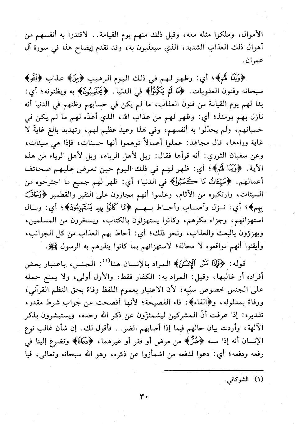 48 - {وَبَدَا لَهُمْ}؛ أي: وظهر لهم في ذلك اليوم الرهيب {مِنَ} عذاب {اللَّهِ} سبحانه وفنون العقوبات. {مَا لَمْ يَكُونُوا} في الدنيا. {يَحْتَسِبُونَ} به ويظنونه؛ أي: بدا لهم يوم القيامة من فنون العذاب، ما لم يكن في حسابهم وظنهم في الدنيا أنه نازل بهم يومئذ؛ أي: وظهر لهم من عذاب الله، الذي أعدّه لهم ما لم يكن في حسبانهم، ولم يحدّثوا به أنفسهم، وفي هذا وعيد عظيم لهم، وتهديد بالغ غايةً لا غاية وراءها، قال مجاهد: عملوا أعمالًا توهموا أنها حسنات، فإذا هي سيئات، وعن سفيان الثوري: أنه قرأها فقال: ويل لأهل الرياء، ويل لأهل الرياء من هذه الآية. {وَبَدَا لَهُمْ}؛ أي: ظهر لهم في ذلك اليوم حين تعرض عليهم صحائف أعمالهم. {سَيِّئَاتُ مَا كَسَبُوا} في الدنيا؛ أي: ظهر لهم جميع ما اجترحوه من السيئات، وارتكبوه من الآثام، وعلموا أنهم مجازون على النقير والقطمير {وَحَاقَ بِهِمْ}؛ أي: نزل وأصاب وأحاط بهم {مَا كَانُوا بِهِ يَسْتَهْزِئُونَ}؛ أي: وبال استهزائهم، وجزاء مكرهم، وكانوا يستهزئون بالكتاب، ويسخرون من المسلمين، ويهزؤون بالبعث والعذاب، ونحو ذلك؛ أي: أحاط بهم العذاب من كل الجوانب، وأيقنوا أنهم مواقعوه لا محالة؛ لاستهزائهم بما كانوا ينذرهم به الرسول - صلى الله عليه وسلم -.