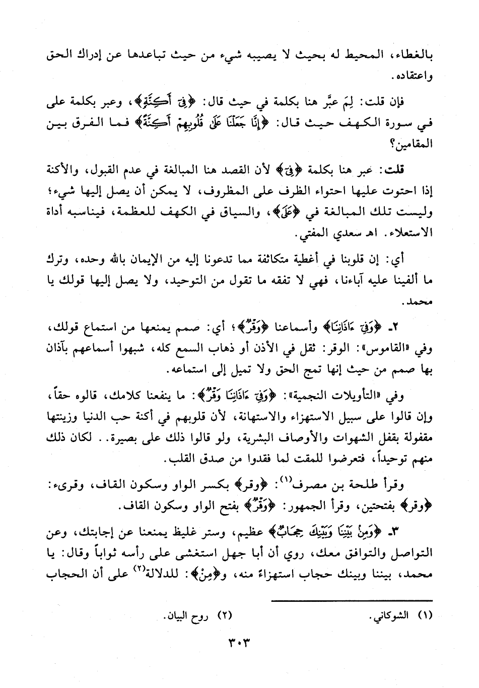 2 - {وَفِي آذَانِهِمْ} وأسماعنا {وَقْرًا}؛ أي: صمم يمنعها من استماع قولك، وفي "القاموس": الوقر: ثقل في الأذن أو ذهاب السمع كله، شبهوا أسماعهم بآذان بها صمم من حيث إنها تمج الحق ولا تميل إلى استماعه.