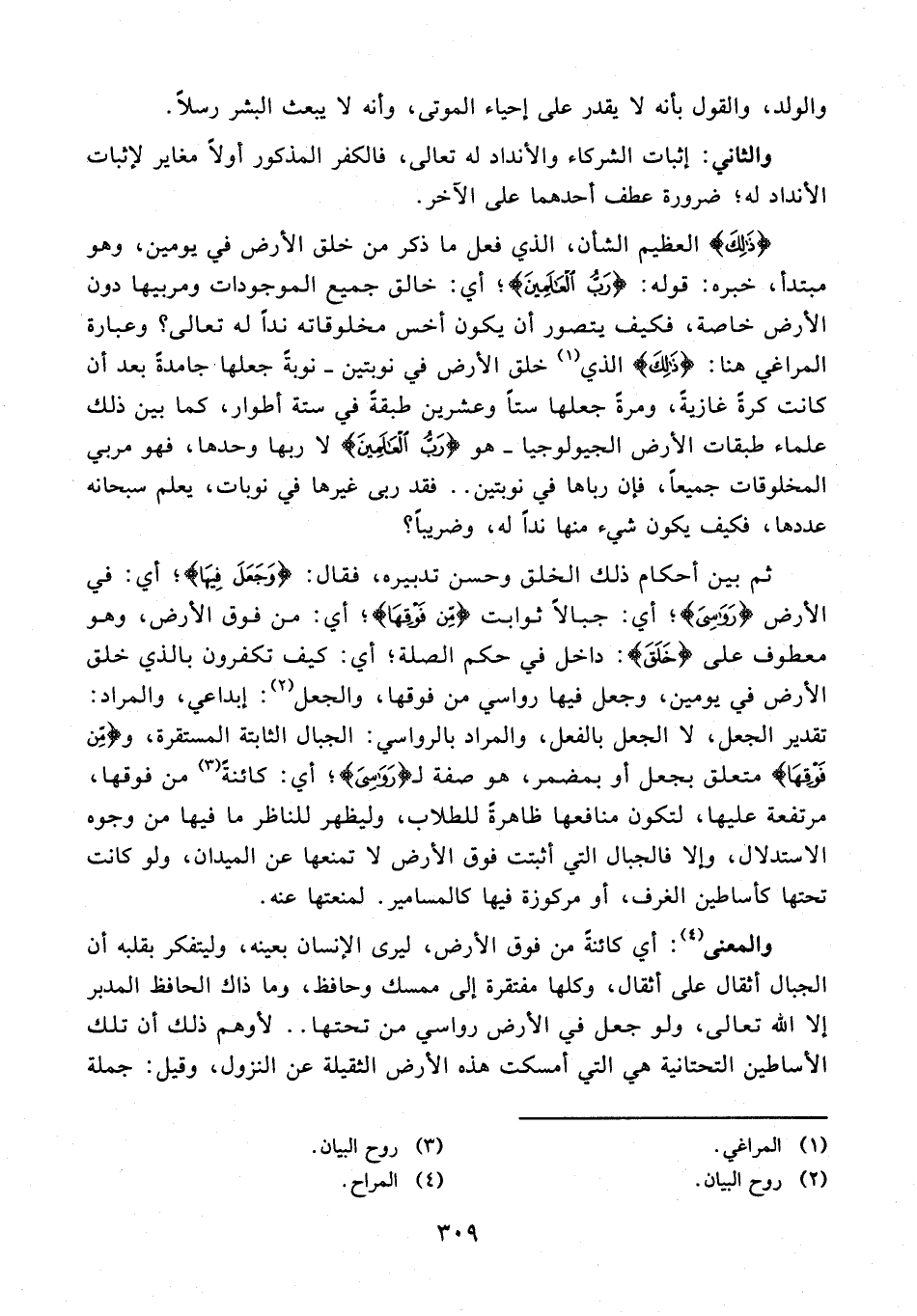 {ذَلِكَ} العظيم الشأن، الذي فعل ما ذكر من خلق الأرض في يومين، وهو مبتدأ، خبره: قوله: {رَبُّ الْعَالَمِينَ}؛ أي: خالق جميع الموجودات ومربيها دون الأرض خاصة، فكيف يتصور أن يكون أخس مخلوقاته ندًا له تعالى؟ وعبارة المراغي هنا: {ذَلِكَ} الذي (¬1) خلق الأرض في نوبتين - نوبةً جعلها جامدةً بعد أن كانت كرةً غازيةً، ومرةً جعلها ستًا وعشرين طبقةً في ستة أطوار، كما بين ذلك علماء طبقات الأرض الجيولوجيا - هو {رَبُّ الْعَالَمِينَ} لا ربها وحدها، فهو مربي المخلوقات جميعًا، فإن رباها في نوبتين .. فقد ربى غيرها في نوبات، يعلم سبحانه عددها، فكيف يكون شيء منها ندًا له، وضريبًا؟