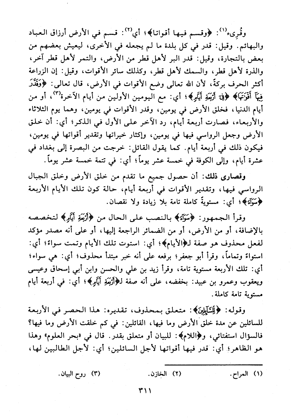 وقُرِىء (¬1): {وقسم فيها أقواتا}؛ أي (¬2): قسم في الأرض أرزاق العباد والبهائم. وقيل: قدر في كل بلدة ما لم يجعله في الأخرى، ليعيش بعضهم من بعض بالتجارة، وقيل: قدر البر لأهل قطر من الأرض، والتمر لأهل قطر آخر، والذرة لأهل قطر، والسمك لأهل قطر، وكذلك سائر الأقوات، وقيل: إن الزراعة أكثر الحرف بركةً، لأن الله تعالى وضع الأقوات في الأرض، قال تعالى: {وَقَدَّرَ فِيهَا أَقْوَاتَهَا} {فِي أَرْبَعَةِ أَيَّامٍ}؛ أي: مع اليومين الأولين من أيام الآخرة (¬3)، أو من أيام الدنيا، فخلق الأرض في يومين، وقدر الأقوات في يومين، وهما يوم الثلاثاء والأربعاء، فصارت أربعة أيام، رد الآخر على الأول في الذكر؛ أي: أن خلق الأرض وجعل الرواسي فيها في يومين، وإكثار خيراتها وتقدير أقواتها في يومين، فيكون ذلك في أربعة أيام. كما يقول القائل: خرجت من البصرة إلى بغداد في عشرة أيام، وإلى الكوفة في خمسة عشر يومًا؛ أي: في تتمة خمسة عشر يومًا.