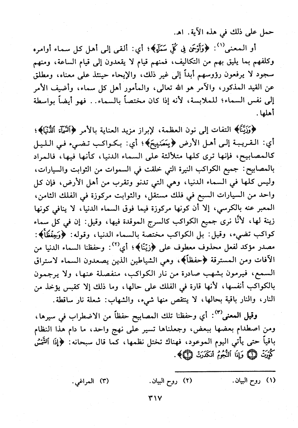 وقيل المعنى (¬3): أي وحفظنا تلك المصابيح حفظًا من الاضطراب في سيرها، ومن اصطدام بعضها ببعض، وجعلناها تسير على نهج واحد، ما دام هذا النظام باقيًا حتى يأتي اليوم الموعود، فهناك تختل نظمها، كما قال سبحانه: {إِذَا الشَّمْسُ كُوِّرَتْ (1) وَإِذَا النُّجُومُ انْكَدَرَتْ (2)}.