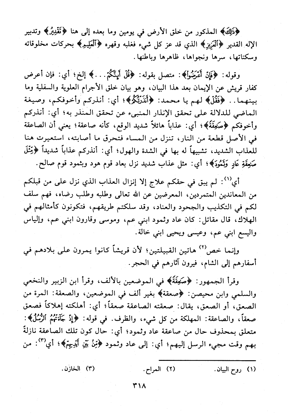 13 - وقوله: {فَإِنْ أَعْرَضُوا}: متصل بقوله: {قُلْ أَئِنَّكُمْ ...} إلخ؛ أي: فإن أعرض كفار قريش عن الإيمان بعد هذا البيان، وهو بيان خلق الأجرام العلوية والسفلية وما بينهما .. {فَقُلْ} لهم يا محمد: {أَنْذَرْتُكُمْ}؛ أي: أنذركم وأخوفكم، وصيغة الماضي للدلالة على تحقق الإنذار المنبىء عن تحقق المنذر به؛ أي: أنذركم وأخوفكم {صَاعِقَةً}؛ أي: عذابًا هائلًا شديد الوقع، كأنه صاعقة؛ يعني أن الصاعقة في الأصل قطعة من النار، تنزل من المساء فتحرق ما أصابته، استعيرت هنا للعذاب الشديد، تشبيهًا له بها في الشدة والهول؛ أي: أنذركم عذابًا شديدًا {مِثْلَ صَاعِقَةِ عَادٍ وَثَمُودَ}؛ أي: مثل عذاب شديد نزل بعاد قوم هود وبثمود قوم صالح.