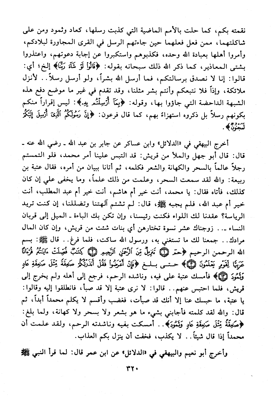 أخرج البيهقي في "الدلائل" وابن عساكر عن جابر بن عبد الله - رضي الله عنه - قال: قال أبو جهل والملأ من قريش: قد التبس علينا أمر محمد، فلو التمستم رجلًا عالمًا بالسحر والكهانة والشعر فكلمه، ثم أتانا ببيان من أمره، فقال عتبة بن ربيعة: والله لقد سمعت السحر، وعلمت من ذلك علمًا، وما يخفى علي إن كان كذلك، فأتاه فقال: يا محمد، أنت خير أم هاشم، أنت خير أم عبد المطلب، أنت خير أم عبد الله، فلم يجبه - صلى الله عليه وسلم -، قال: لم تشتم آلهتنا وتضللنا، إن كنت تريد الرياسة؟ عقدنا لك اللواء فكنت رئيسنا، وإن تكن بك الباءة - الميل إلى قربان النساء - .. زوجناك عشر نسوة تختارهن أي بنات شئت من قريش، وإن كان المال مرادك .. جمعنا لك ما تستغني به، ورسول الله ساكت، فلما فرغ .. قال - صلى الله عليه وسلم -: بِسْمِ اللَّهِ الرَّحْمَنِ الرَّحِيمِ {حم (1) تَنْزِيلٌ مِنَ الرَّحْمَنِ الرَّحِيمِ (2) كِتَابٌ فُصِّلَتْ آيَاتُهُ قُرْآنًا عَرَبِيًّا لِقَوْمٍ يَعْلَمُونَ (3)} حتى بلغ {فَإِنْ أَعْرَضُوا فَقُلْ أَنْذَرْتُكُمْ صَاعِقَةً مِثْلَ صَاعِقَةِ عَادٍ وَثَمُودَ (13)} فأمسك عتبة على فيه، وناشده الرحم، فرجع إلى أهله ولم يخرج إلى قريش، فلما احتبس عنهم .. قالوا: لا نرى عتبة إلا قد صبأ، فانطلقوا إليه وقالوا: يا عتبة، ما حبسك عنا إلا أنك قد صبأت، فغضب وأقسم لا يكلم محمدًا أبدًا، ثم قال: والله لقد كلمته فأجابني بشيء ما هو بشعر ولا بسحر ولا كهانة، ولما بلغ: {صَاعِقَةً مِثْلَ صَاعِقَةِ عَادٍ وَثَمُودَ} .. أمسكت بفيه وناشدته الرحم، ولقد علمت أن محمدًا إذا قال شيئًا .. لا يكذب؛ فخفت أن ينزل بكم العذاب.