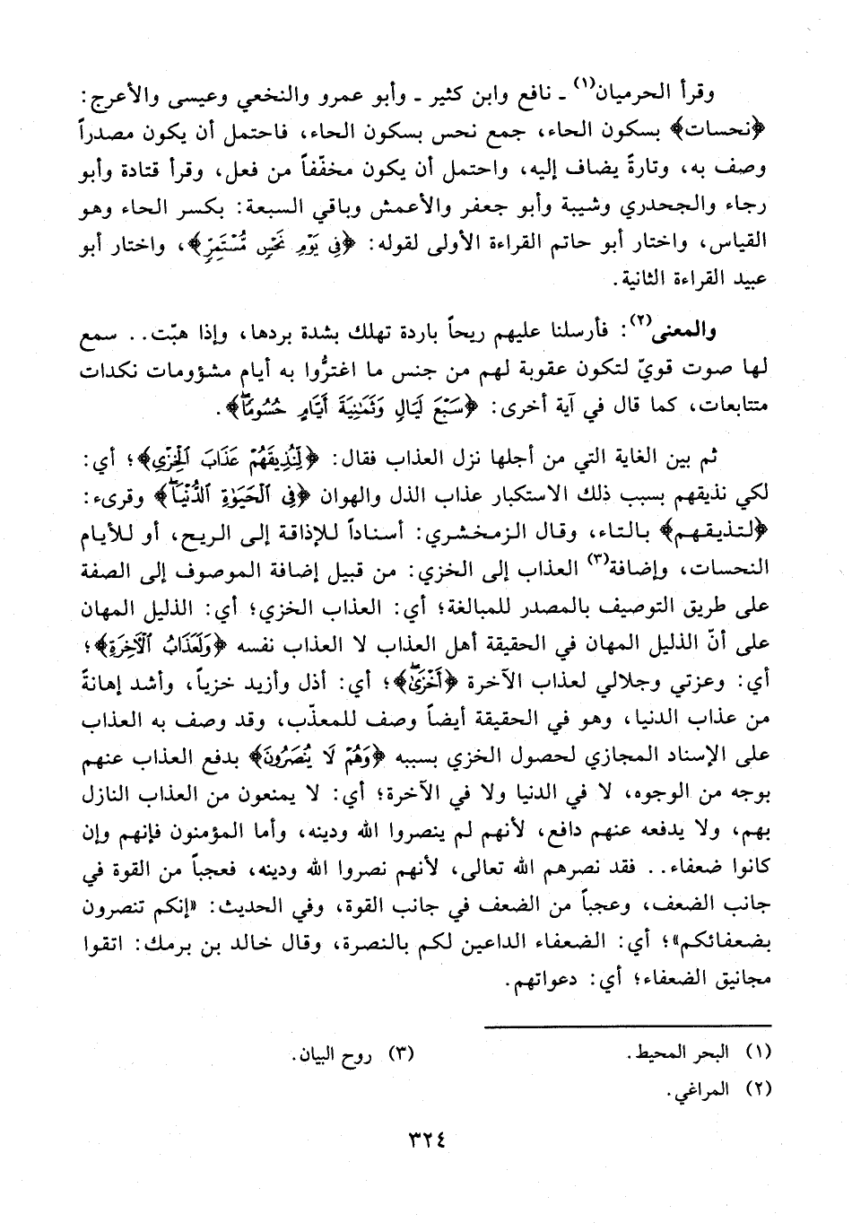 وقرأ الحرميان (¬1) - نافع وابن كثير - وأبو عمرو والنخعي وعيسى والأعرج: {نحسات} بسكون الحاء، جمع نحس بسكون الحاء، فاحتمل أن يكون مصدرًا وصف به، وتارةً يضاف إليه، واحتمل أن يكون مخفّفًا من فعل، وقرأ قتادة وأبو رجاء والجحدري وشيبة وأبو جعفر والأعمش وباقي السبعة: بكسر الحاء وهو القياس، واختار أبو حاتم القراءة الأولى لقوله: {فِي يَوْمِ نَحْسٍ مُسْتَمِرٍّ}، واختار أبو عبيد القراءة الثانية.