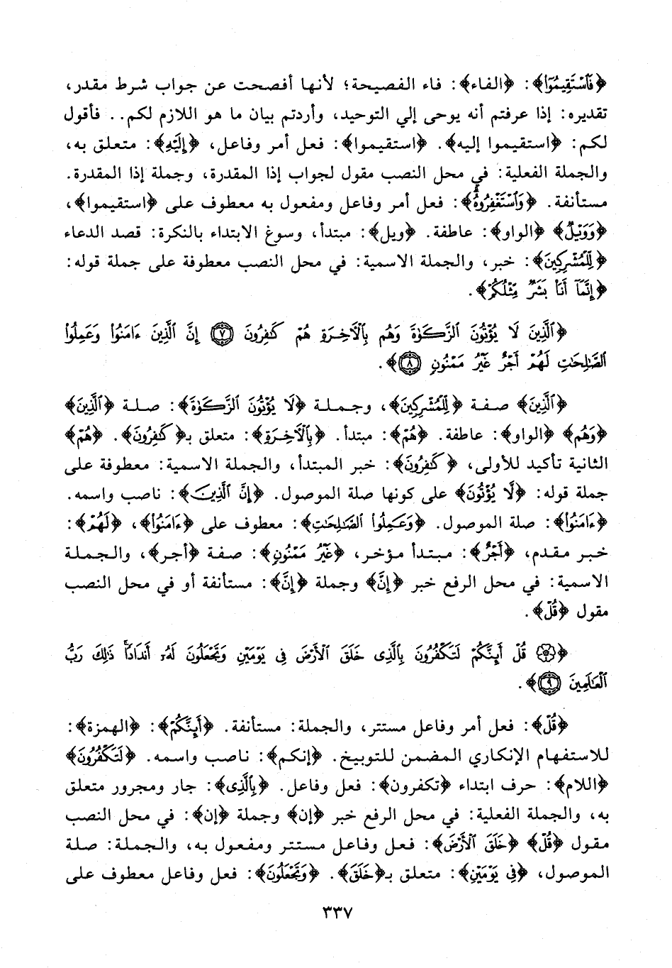 {فَاسْتَقِيمُوا}: {الفاء}: فاء الفصيحة؛ لأنها أفصحت عن جواب شرط مقدر، تقديره: إذا عرفتم أنه يوحى إلى التوحيد، وأردتم بيان ما هو اللازم لكم .. فأقول لكم: {اسْتَقِيمُوا إِلَيْهِ}. {اسْتَقِيمُوا}: فعل أمر وفاعل، {إِلَيْهِ}: متعلق به، والجملة الفعلية: في محل النصب مقول لجواب إذا المقدرة، وجملة إذا المقدرة. مستأنفة. {وَاسْتَغْفِرُوهُ}: فعل أمر وفاعل ومفعول به معطوف على {اسْتَقِيمُوا}، {وَوَيْلٌ} {الواو}: عاطفة. {ويل}: مبتدأ، وسوغ الابتداء بالنكرة: قصد الدعاء {لِلْمُشْرِكِينَ}: خبر، والجملة الاسمية: في محل النصب معطوفة على جملة قوله: {إِنَّمَا أَنَا بَشَرٌ مِثْلُكُمْ}.