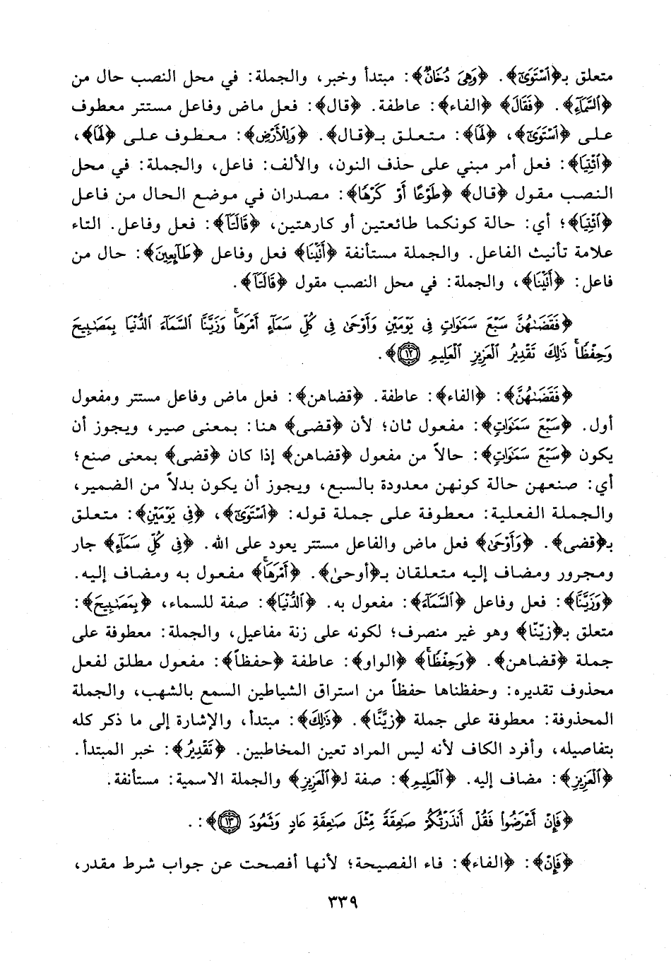 {فَقَضَاهُنَّ}: {الفاء}: عاطفة. {قَضَاهُنَّ}: فعل ماض وفاعل مستتر ومفعول أول. {سَبْعَ سَمَاوَاتٍ}: مفعول ثان؛ لأن {قضى} هنا: بمعنى صير، ويجوز أن يكون {سَبْعَ سَمَاوَاتٍ}: حالًا من مفعول {قَضَاهُنَّ} إذا كان {قضى} بمعنى صنع؛ أي: صنعهن حالة كونهن معدودة بالسبع، ويجوز أن يكون بدلًا من الضمير، والجملة الفعلية: معطوفة على جملة قوله: {اسْتَوَى}، {فِي يَوْمَيْنِ}: متعلق بـ {قضى}. {وَأَوْحَى} فعل ماض والفاعل مستتر يعود على الله. {فِي كُلِّ سَمَاءٍ} جار ومجرور ومضاف إليه متعلقان بـ {أوحى}. {أَمْرَهَا} مفعول به ومضاف إليه. {وَزَيَّنَّا}: فعل وفاعل {السَّمَاءَ}: مفعول به. {الدُّنْيَا}: صفة للسماء، {بِمَصَابِيحَ}: متعلق بـ {زَيَّنَّا} وهو غير منصرف؛ لكونه على زنة مفاعيل، والجملة: معطوفة على جملة {قَضَاهُنَّ}. {وَحِفْظًا} {الواو}: عاطفة {حِفْظًا}: مفعول مطلق لفعل محذوف تقديره: وحفظناها حفظًا من استراق الشياطين السمع بالشهب، والجملة المحذوفة: معطوفة على جملة {زَيَّنَّا}. {ذَلِكَ}: مبتدأ، والإشارة إلى ما ذكر كله بتفاصيله، وأفرد الكاف لأنه ليس المراد تعين المخاطبين. {تَقْدِيرُ}: خبر المبتدأ. {الْعَزِيزِ}: مضاف إليه. {الْعَلِيمِ}: صفة لـ {الْعَزِيزِ} والجملة الاسمية: مستأنفة.