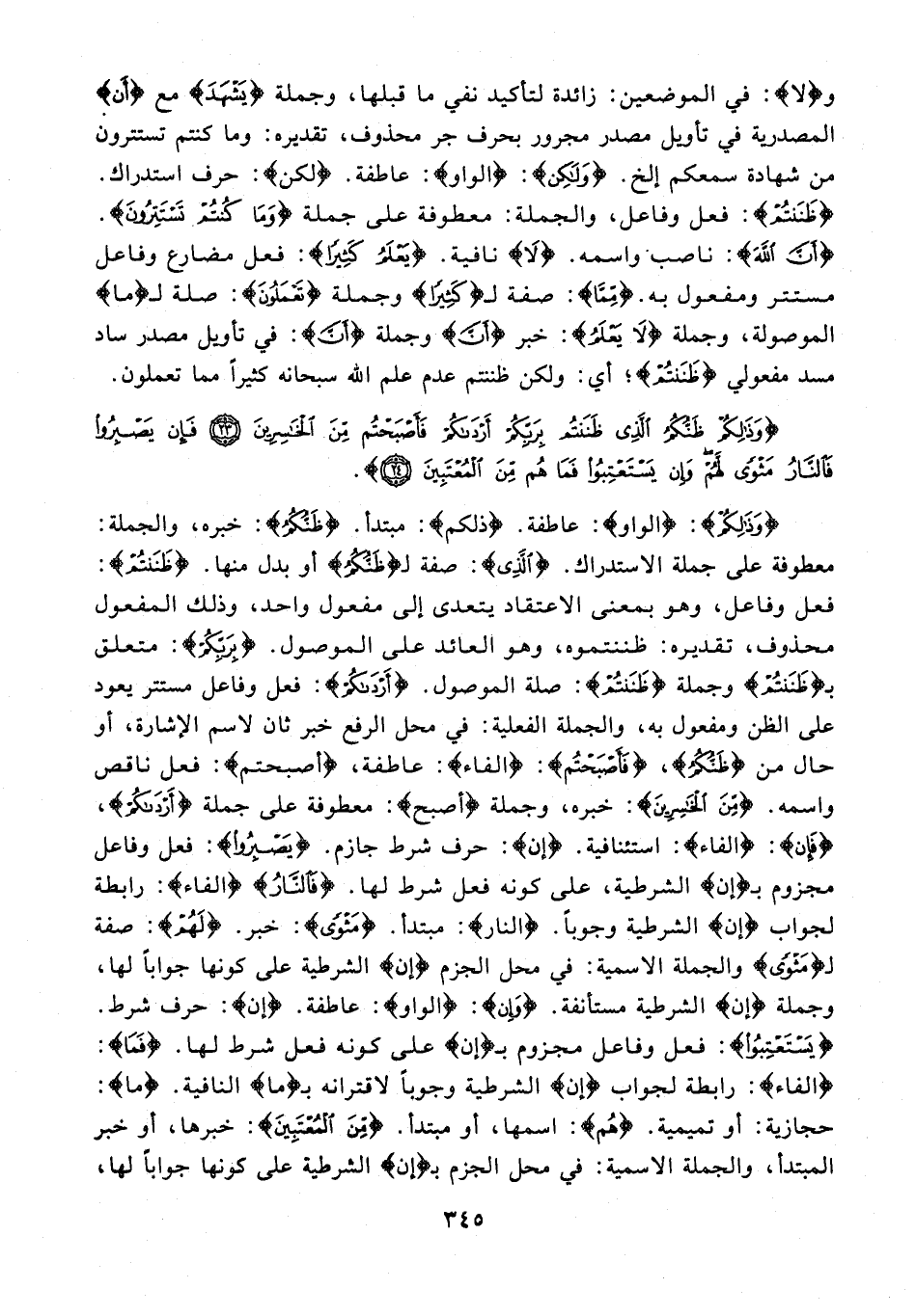 {وَذَلِكُمْ}: {الواو}: عاطفة. {ذَلِكُمْ}: مبتدأ. {ظَنُّكُمُ}: خبره، والجملة: معطوفة على جملة الاستدراك. {الَّذِي}: صفة لـ {ظَنُّكُمُ} أو بدل منها. {ظَنَنْتُمْ}: فعل وفاعل، وهو بمعنى الاعتقاد يتعدى إلى مفعول واحد، وذلك المفعول محذوف، تقديره: ظننتموه، وهو العائد على الموصول. {بِرَبِّكُمْ}: متعلق بـ {ظَنَنْتُمْ} وجملة {ظَنَنْتُمْ}: صلة الموصول. {أَرْدَاكُمْ}: فعل وفاعل مستتر يعود على الظن ومفعول به، والجملة الفعلية: في محل الرفع خبر ثان لاسم الإشارة، أو حال من {ظَنُّكُمُ}، {فَأَصْبَحْتُمْ}: {الفاء}: عاطفة، {أَصْبَحْتُمْ}: فعل ناقص واسمه. {مِنَ الْخَاسِرِينَ}: خبره، وجملة {أصبح}: معطوفة على جملة {أَرْدَاكُمْ}، {فَإِنْ}: {الفاء}: استئنافية. {إن}: حرف شرط جازم. {يَصْبِرُوا}: فعل وفاعل مجزوم بـ {إن} الشرطية، على كونه فعل شرط لها. {فَالنَّارُ} {الفاء}: رابطة لجواب {إن} الشرطية وجوبًا. {النَّارُ}: مبتدأ. {مَثْوًى}: خبر. {لَهُمْ}: صفة لـ {مَثْوًى} والجملة الاسمية: في محل الجزم {إن} الشرطية على كونها جوابًا لها، وجملة {إن} الشرطية مستأنفة. {وَإِنْ}: {الواو}: عاطفة. {إن}: حرف شرط. {يَسْتَعْتِبُوا}: فعل وفاعل مجزوم بـ {إن} على كونه فعل شرط لها. {فَمَا}: {الفاء}: رابطة لجواب {إن} الشرطية وجوبًا لاقترانه بـ {ما} النافية. {ما}: حجازية: أو تميمية. {هُمْ}: اسمها، أو مبتدأ. {مِنَ الْمُعْتَبِينَ}: خبرها، أو خبر المبتدأ، والجملة الاسمية: في محل الجزم بـ {إِنْ} الشرطية على كونها جوابًا لها،