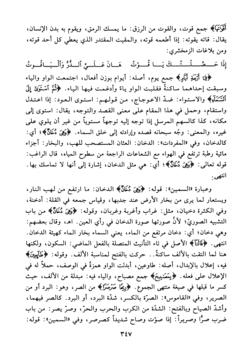 {فِي أَرْبَعَةِ أَيَّامٍ} جمع يوم، أصله: أيوام بوزن أفعال، اجتمعت الواو والياء وسبقت إحداهما ساكنةً فقلبت الواو ياءً وأدغمت فيها الياء. {ثُمَّ اسْتَوَى إِلَى السَّمَاءِ} والاستواء: ضدّ الاعوجاج، من قولهم: استوى العود: إذا اعتدل واستقام، وحمل في هذا المقام على معنى القصد والتوجه، يقال: استوى إلى مكانه، كذا كالسهم المرسل إذا توجه إليه توجهًا مستويًا من غير أن يلوي على غيره، والمعنى: وجّه سبحانه قصده وإرادته إلى خلق السماء. {وَهِيَ دُخَانٌ}؛ أي: كالدخان، وفي "المفردات": الدخان: العثان المستصحب للهب، والبخار: أجزاء مائية رطبة ترتفع في الهواء مع الشعاعات الراجعة من سطوح المياه، قال الراغب: قوله تعالى: {وَهِيَ دُخَانٌ}؛ أي: هي مثل الدخان، إشارة إلى أنها لا تماسك بها. انتهى.