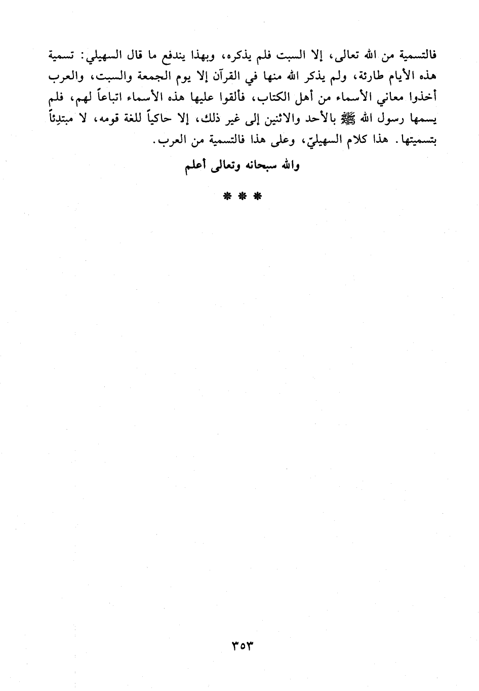 فالتسمية من الله تعالى، إلا السبت فلم يذكره، وبهذا يندفع ما قال السهيلي: تسمية هذه الأيام طارئة، ولم يذكر الله منها في القرآن إلا يوم الجمعة والسبت، والعرب أخذوا معاني الأسماء من أهل الكتاب، فألقوا عليها هذه الأسماء اتباعًا لهم، فلم يسمها رسول الله - صلى الله عليه وسلم - بالأحد والاثنين إلى غير ذلك، إلا حاكيًا للغة قومه، لا مبتدِئًا بتسميتها. هذا كلام السهيليّ، وعلى هذا فالتسمية من العرب.