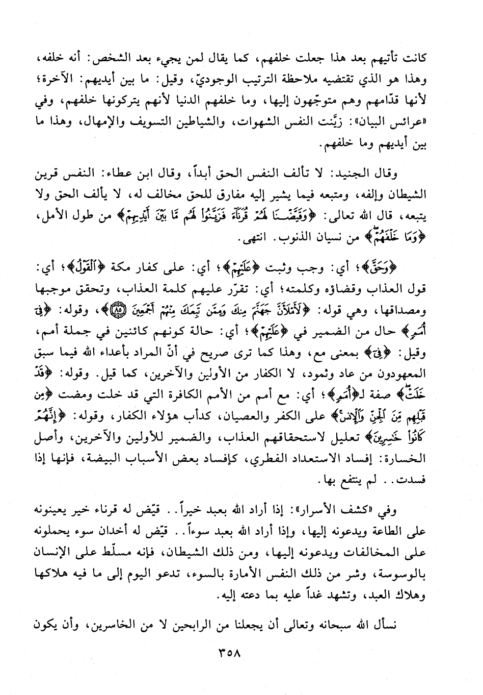 وقال الجنيد: لا تألف النفس الحق أبدًا، وقال ابن عطاء: النفس قرين الشيطان وإلفه، ومتبعه فيما يشير إليه مفارق للحق مخالف له، لا يألف الحق ولا يتبعه، قال الله تعالى: {وَقَيَّضْنَا لَهُمْ قُرَنَاءَ فَزَيَّنُوا لَهُمْ مَا بَيْنَ أَيْدِيهِمْ} من طول الأمل، {وَمَا خَلْفَهُمْ} من نسيان الذنوب. انتهى.