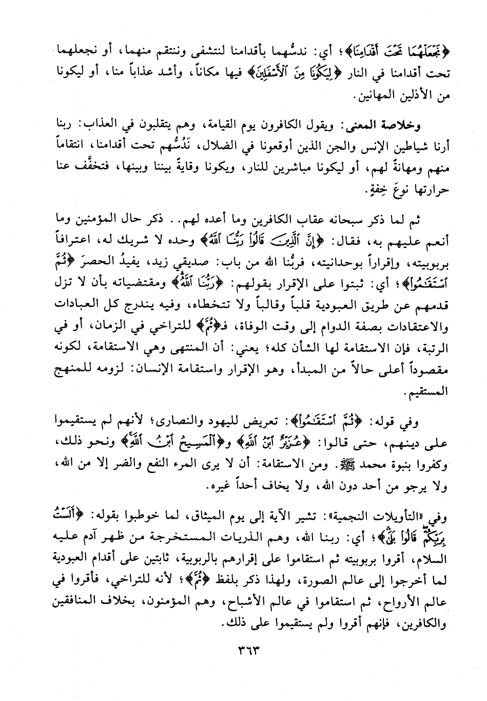 وفي قوله: {ثُمَّ اسْتَقَامُوا}: تعريض لليهود والنصارى؛ لأنهم لم يستقيموا على دينهم، حتى قالوا: {عُزَيْرٌ ابْنُ اللَّهِ} و {الْمَسِيحُ ابْنُ اللَّهِ} ونحو ذلك، وكفر بنبوة محمد - صلى الله عليه وسلم -. ومن الاستقامة: أن لا يرى المرء النفع والضر إلا من الله، ولا يرجو من أحد دون الله، ولا يخاف أحدًا غيره.