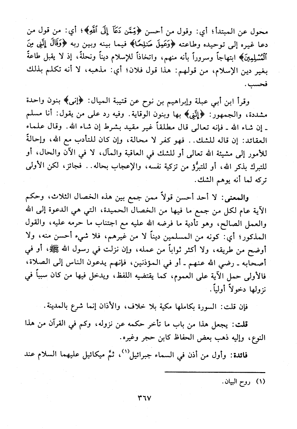 والمعنى: لا أحد أحسن قولًا ممن جمع بين هذه الخصال الثلاث، وحكم الآية عام لكل من جمع ما فيها من الخصال الحميدة، التي هي الدعوة إلى الله والعمل الصالح، وهو تأدية ما فرضه الله عليه مع اجتناب ما حرمه عليه، والقول المذكور؛ أي: كونه من المسلمين دينًا لا من غيرهم، فلا شيء أحسن منه، ولا أوضح من طريقه، ولا أكثر ثوابًا من عمله، وإن نزلت في رسول الله - صلى الله عليه وسلم -، أو في أصحابه - رضي الله عنهم - أو في المؤذنين، فإنهم يدعون الناس إلى الصلاة، فالأولى حمل الآية على العموم، كما يقتضيه اللفظ، ويدخل فيها من كان سببًا في نزولها دخولًا أوليًا.