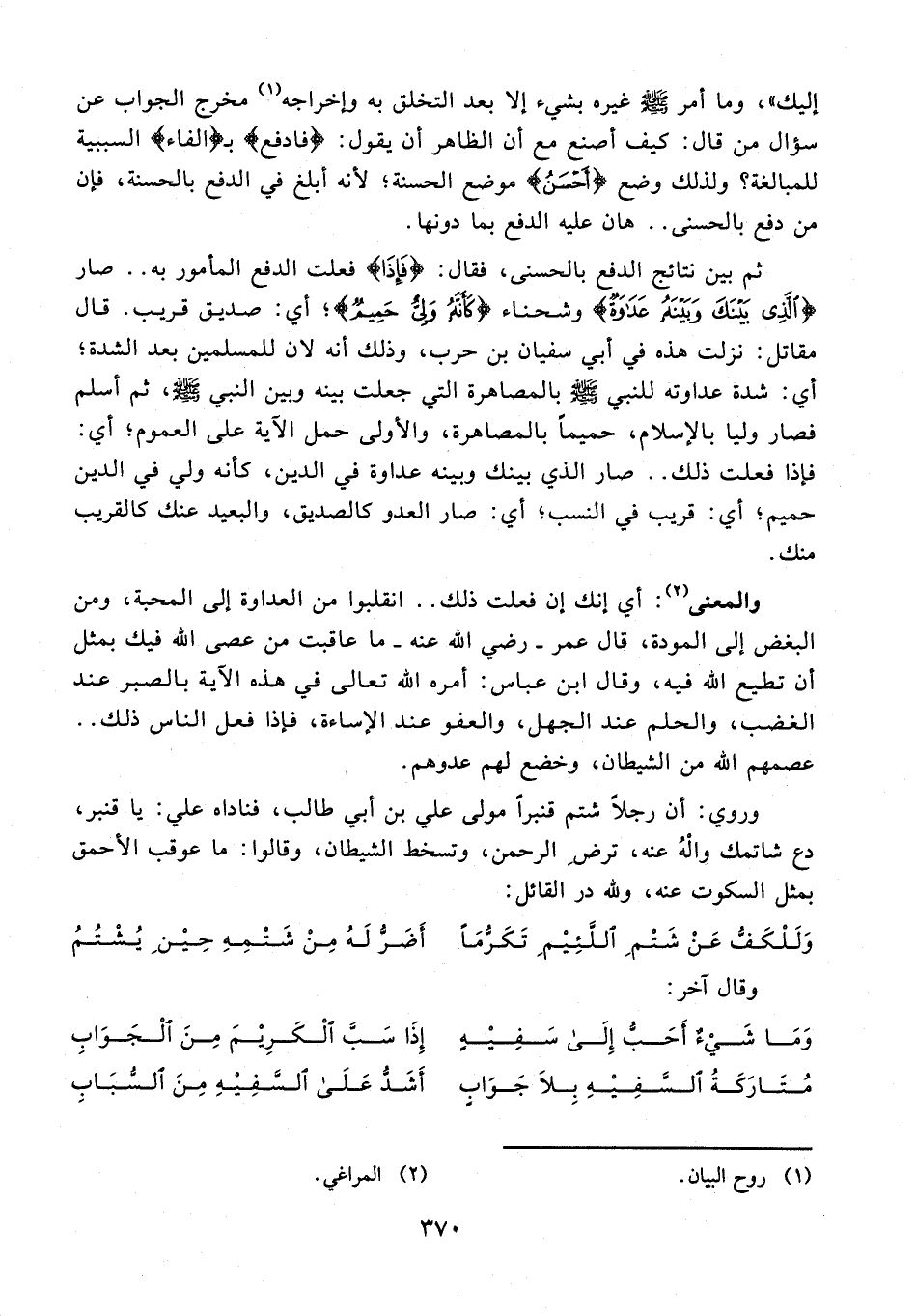 والمعنى (¬2): أي إنك إن فعلت ذلك .. انقلبوا من العداوة إلى المحبة، ومن البغض إلى المودة، قال عمر - رضي الله عنه - ما عاقبت من عصى الله فيك بمثل أن تطيع الله فيه، وقال ابن عباس: أمره الله تعالى في هذه الآية بالصبر عند الغضب، والحلم عند الجهل، والعفو عند الإساءة، فإذا فعل الناس ذلك .. عصمهم الله من الشيطان، وخضع لهم عدوهم.