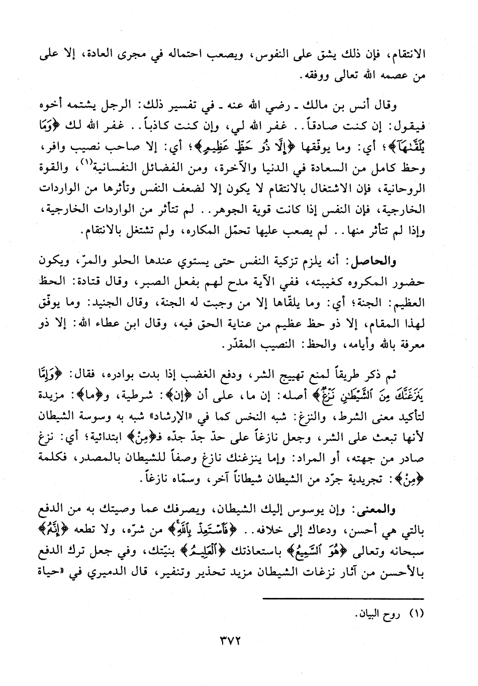 وقال أنس بن مالك - رضي الله عنه - في تفسير ذلك: الرجل يشتمه أخوه فيقول: إن كنت صادقًا .. غفر الله لي، وإن كنت كاذبًا .. غفر الله لك {وَمَا يُلَقَّاهَا}؛ أي: وما يوفّقها {إِلَّا ذُو حَظٍّ عَظِيمٍ}؛ أي: إلا صاحب نصيب وافر، وحظ كامل من السعادة في الدنيا والاخرة، ومن الفضائل النفسانية (¬1)، والقوة الروحانية، فإن الاشتغال بالانتقام لا يكون إلا لضعف النفس وتأثرها من الواردات الخارجية، فإن النفس إذا كانت قوية الجوهر .. لم تتأثر من الواردات الخارجية، وإذا لم تتأثر منها .. لم يصعب عليها تحمّل المكاره، ولم تشتغل بالانتقام.