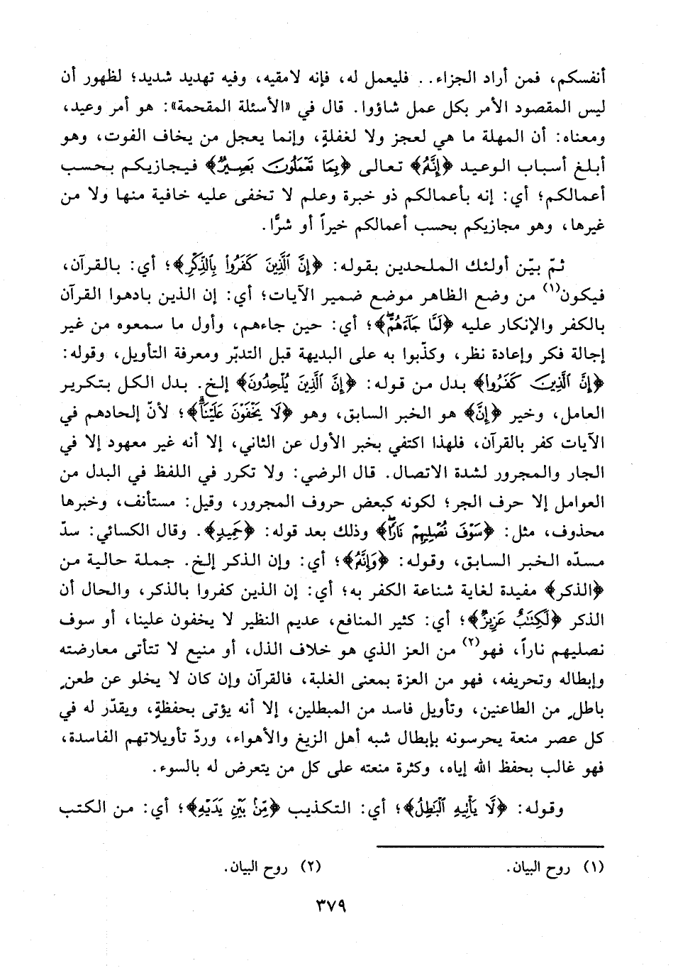 41 - ثمّ بيّن أولئك الملحدين بقوله: {إِنَّ الَّذِينَ كَفَرُوا بِالذِّكْرِ}؛ أي: بالقرآن، فيكون (¬1) من وضع الظاهر موضع ضمير الآيات؛ أي: إن الذين بادهوا القرآن بالكفر والإنكار عليه {لَمَّا جَاءَهُمْ}؛ أي: حين جاءهم، وأول ما سمعوه من غير إجالة فكر وإعادة نظر، وكذّبوا به على البديهة قبل التدبّر ومعرفة التأويل، وقوله: {إِنَّ الَّذِينَ كَفَرُوا} بدل من قوله: {إِنَّ الَّذِينَ يُلْحِدُونَ} إلخ. بدل الكل بتكرير العامل، وخير {إِنَّ} هو الخبر السابق، وهو {لَا يَخْفَوْنَ عَلَيْنَا}؛ لأنّ إلحادهم في الآيات كفر بالقرآن، فلهذا اكتفي بخبر الأول عن الثاني، إلا أنه غير معهود إلا في الجار والمجرور لشدة الاتصال. قال الرضي: ولا تكرر في اللفظ في البدل من العوامل إلا حرف الجر؛ لكونه كبعض حروف المجرور، وقيل: مستأنف، وخبرها محذوف، مثل: {سَوْفَ نُصْلِيهِمْ نَارًا} وذلك بعد قوله: {حَمِيدٍ}. وقال الكسائي: سدّ مسدّه الخبر السابق، وقوله: {وَإِنَّهُ}؛ أي: وإن الذكر إلخ. جملة حالية من {الذكر} مفيدة لغاية شناعة الكفر به؛ أي: إن الذين كفروا بالذكر، والحال أن الذكر {لَكِتَابٌ عَزِيزٌ}؛ أي: كثير المنافع، عدم النظير لا يخفون علينا، أو سوف نصليهم نارًا، فهو (¬2) من العز الذي هو خلاف الذل، أو منيع لا تتأتى معارضته وإبطاله وتحريفه، فهو من العزة بمعنى الغلبة، فالقرآن وإن كان لا يخلو عن طعنٍ باطلٍ من الطاعنين، وتأويل فاسد من المبطلين، إلا أنه يؤتى بحفظةٍ، ويقدّر له في كل عصر منعة يحرسونه بإبطال شبه أهل الزيغ والأهواء، وردّ تأويلاتهم الفاسدة، فهو غالب بحفظ الله إياه، وكثرة منعته على كل من يتعرض له بالسوء.