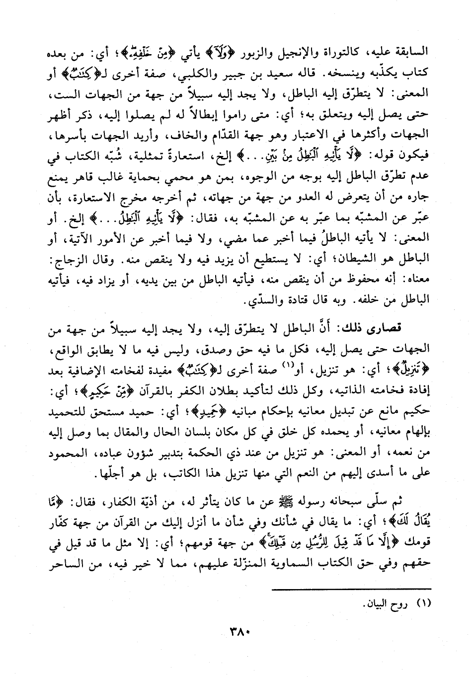 السابقة عليه، كالتوراة والإنجيل والزبور {وَلَا} وَلَا يأتي {مِنْ خَلْفِهِ}؛ أي: من بعده كتاب يكذّبه وينسخه. قاله سعيد بن جبير والكلبي، صفة أخرى لـ {كِتَابٌ} أو المعنى: لا يتطرّق إليه الباطل، ولا يجد إليه سبيلًا من جة من الجهات الست، حتى يصل إليه ويتعلق به؛ أي: متى راموا إبطالًا له لم يصلوا إليه، ذكر أظهر الجهات وأكثرها في الاعتبار وهو جهة القدّام والخاف، وأريد الجهات بأسرها، فيكون قوله: {لَا يَأْتِيهِ الْبَاطِلُ مِنْ بَيْنِ ...} إلخ، استعارةً تمثلية، شُبّه الكتاب في عدم تطرّق الباطل إليه بوجه من الوجوه، بمن هو محمي بحماية غالب قاهر يمنع جاره من أن يتعرض له العدو من جهة من جهاته، ثم أخرجه مخرج الاستعارة، بأن عبّر عن المشبّه بما عبّر به عن المشبّه به، فقال: {لَا يَأْتِيهِ الْبَاطِلُ ...} إلخ. أو المعنى: لا يأتيه الباطلُ فيما أخبر عما مضي، ولا فيما أخبر عن الأمور الآتية، أو الباطل هو الشيطان؛ أي: لا يستطيع أن يزيد فيه ولا ينقص منه. وقال الزجاج: معناه: إنه محفوظ من أن ينقص منه، فيأتيه الباطل من بين يديه، أو يزاد فيه، فيأتيه الباطل من خلفه. وبه قال قتادة والسدّي.