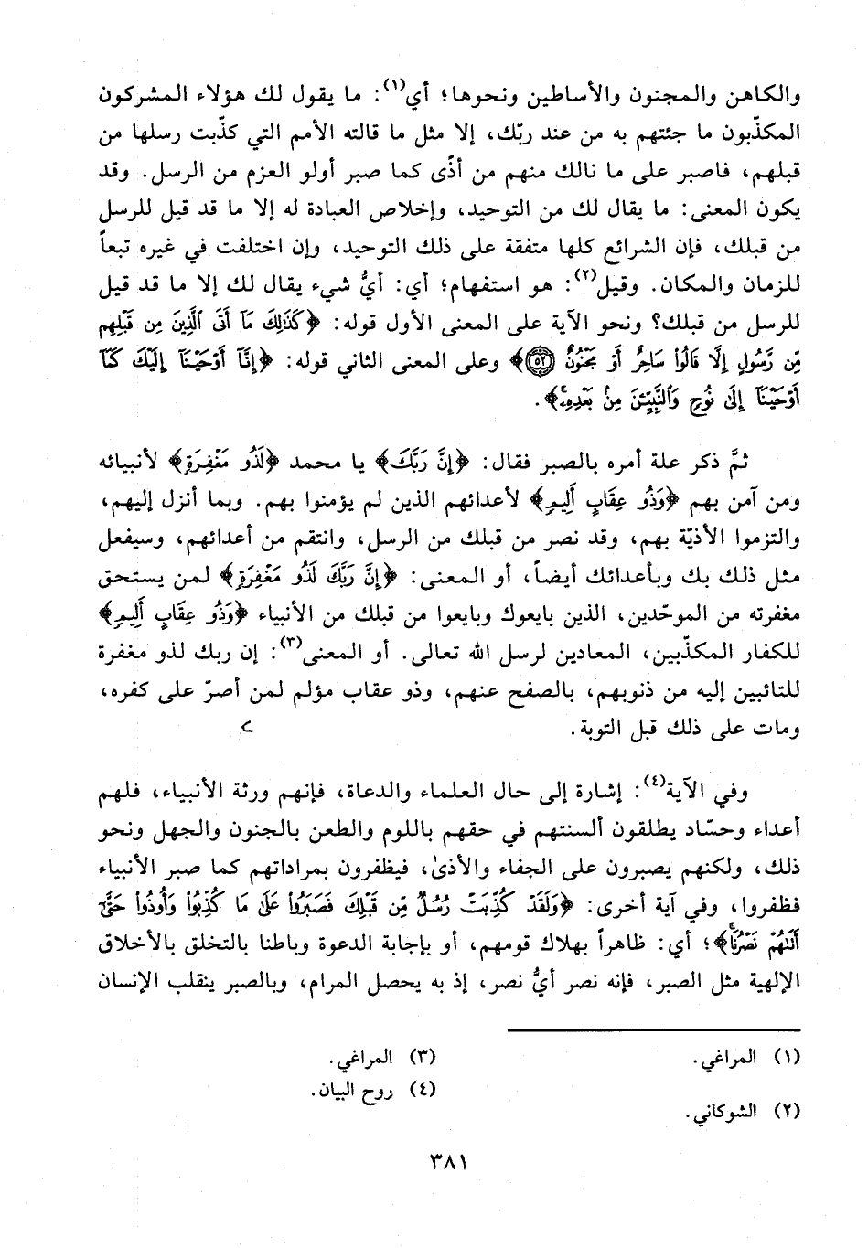 وفي الآية (¬4): إشارة إلى حال العلماء والدعاة، فإنهم ورثة الأنبياء، فلهم أعداء وحسّاد يطلقون ألسنتهم في حقهم باللوم والطعن بالجنون والجهل ونحو ذلك، ولكنهم يصبرون على الجفاء والأذى، فيظفرون بمراداتهم كما صبر الأنبياء فظفروا وفي آية أخرى: {وَلَقَدْ كُذِّبَتْ رُسُلٌ مِنْ قَبْلِكَ فَصَبَرُوا عَلَى مَا كُذِّبُوا وَأُوذُوا حَتَّى أَتَاهُمْ نَصْرُنَا}؛ أي: ظاهرًا بهلاك قومهم، أو بإجابة الدعوة وباطنا بالتخلق بالأخلاق الإلهية مثل الصبر، فإنه نصر أيُّ نصر، إذ به يحصل المرام، وبالصبر ينقلب الإنسان
