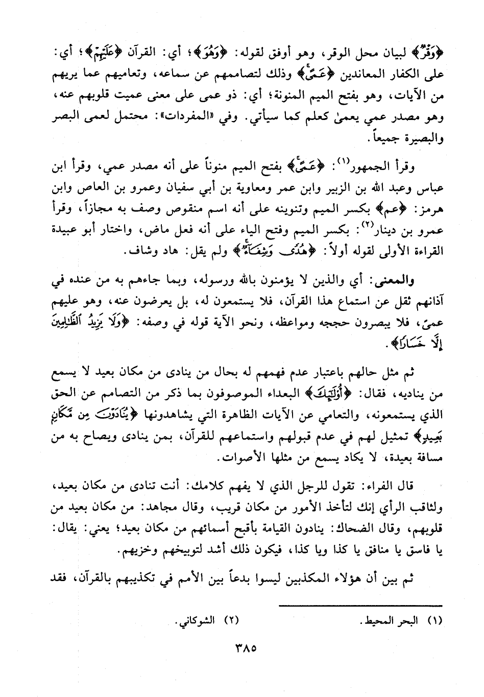 وقرأ الجمهور (¬1): {عَمًى} بفتح الميم منونًا على أنه مصدر عمي، وقرأ ابن عباس وعبد الله بن الزبير وابن عمر ومعاوية بن أبي سفيان وعمرو بن العاص وابن هرمز: {عم} بكسر الميم وتنوينه على أنه اصم منقوص وصف به مجازًا، وقرأ عمرو بن دينار (¬2): بكسر الميم وفتح الياء على أنه فعل ماض، واختار أبو عبيدة القراءة الأولى لقوله أولًا: {هُدًى وَشِفَاءٌ} ولم يقل: هاد وشاف.