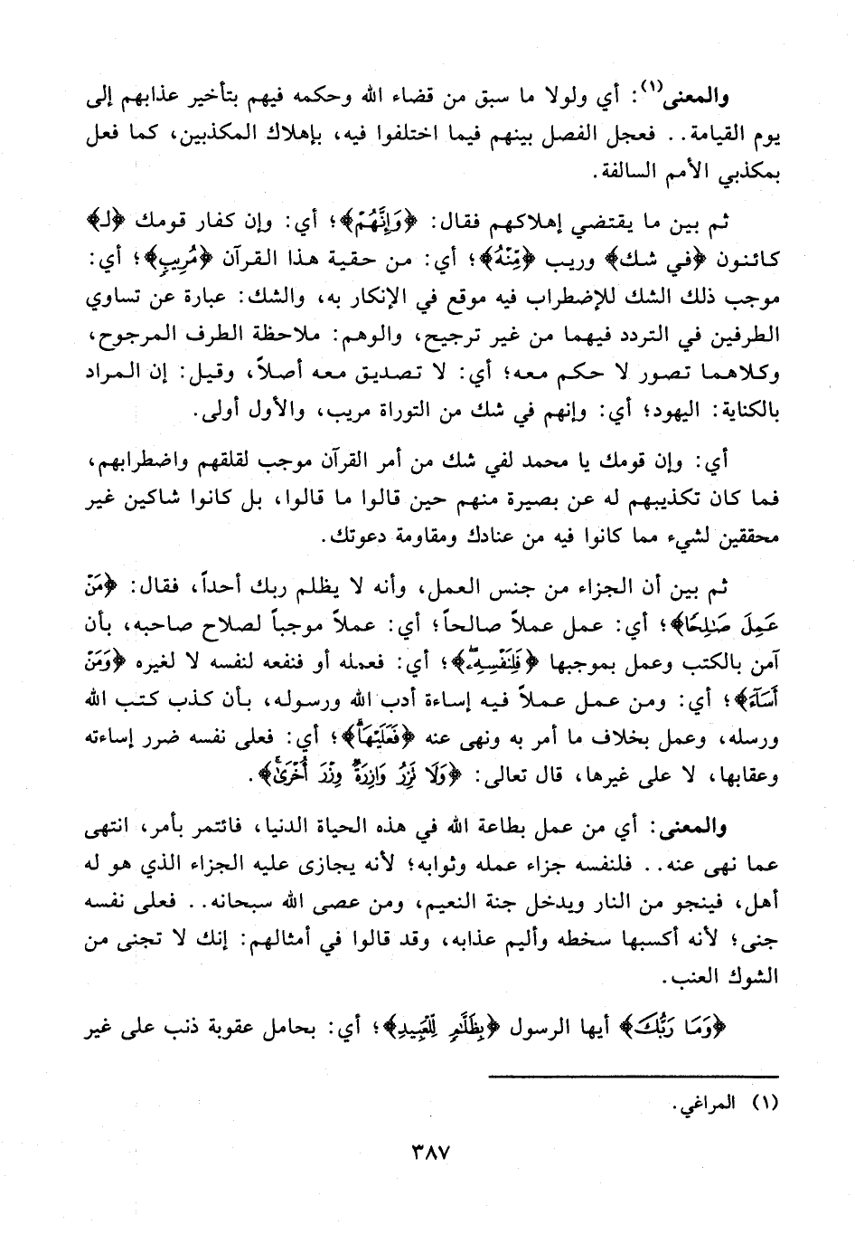 والمعنى (¬1): أي ولولا ما سبق من قضاء الله وحكمه فيهم بتأخير عذابهم إلى يوم القيامة .. فعجل الفصل بينهم فيما اختلفوا فيه، بإهلاك المكذبين، كما فعل بمكذبي الأمم السالفة.
