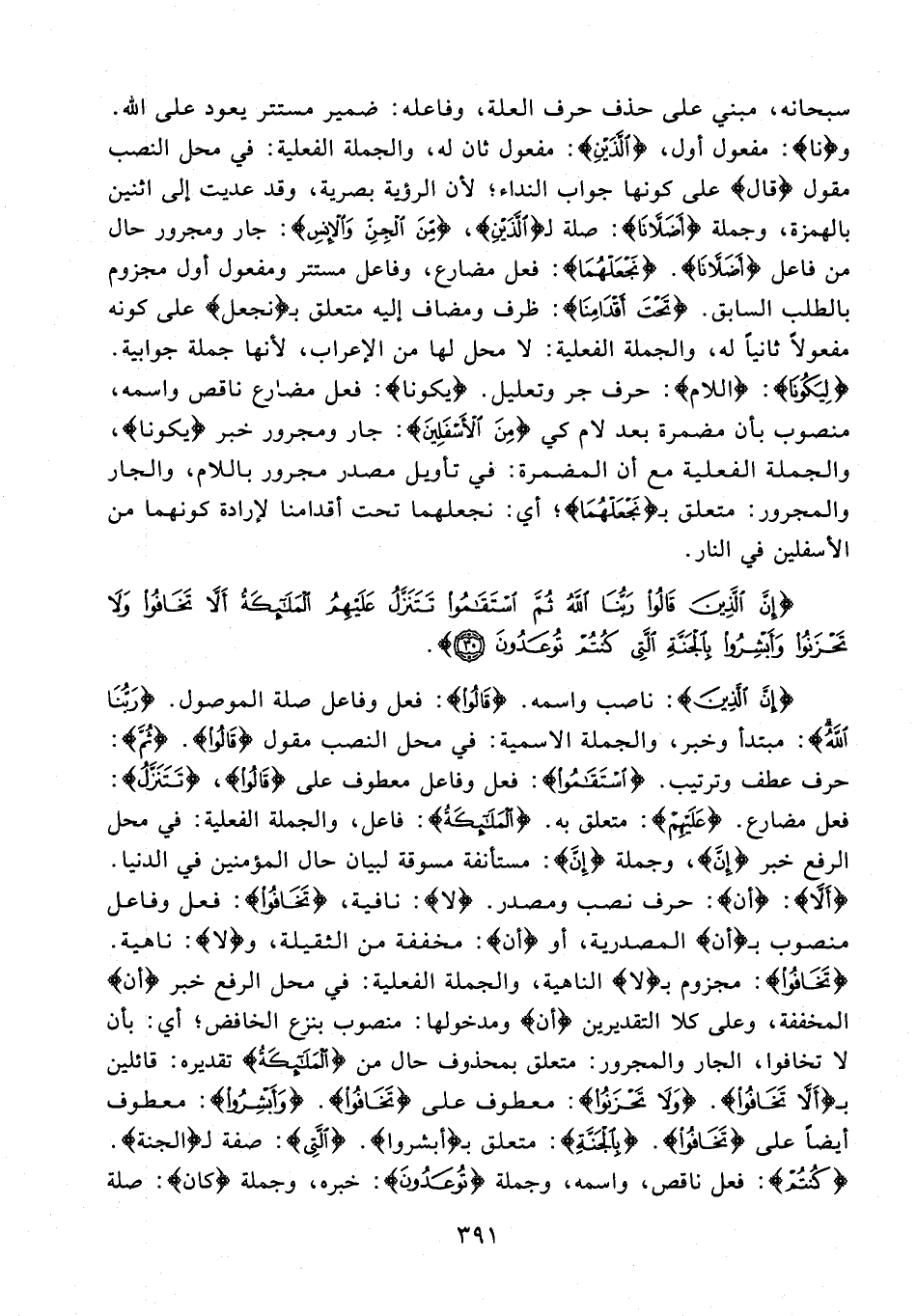 {إِنَّ الَّذِينَ}: ناصب واسمه. {قَالُوا}: فعل وفاعل صلة الموصول. {رَبُّنَا اللَّهُ}: مبتدأ وخبر، والجملة الاسمية: في محل النصب مقول {قَالُوا}. {ثُمَّ}: حرف عطف وترتيب. {اسْتَقَامُوا}: فعل وفاعل معطوف على {قَالُوا}، {تَتَنَزَّلُ}: فعل مضارع. {عَلَيْهِمُ}: متعلق به. {الْمَلَائِكَةُ}: فاعل، والجملة الفعلية: في محل الرفع خبر {إِنَّ}، وجملة {إِنَّ}: مستأنفة مسوقة لبيان حال المؤمنين في الدنيا. {أَلَّا}: {أن}: حرف نصب ومصدر. {لا}: نافية، {تَخَافُوا}: فعل وفاعل منصوب بـ {أن} المصدرية، أو {أن}: مخففة من الثقيلة، و {لا}: ناهية. {تَخَافُوا}: مجزوم بـ {لا} الناهية، والجملة الفعلية: في محل الرفع خبر {أن} المخففة، وعلى كلا التقديرين {أن} ومدخولها: منصوب بنزع الخافض؛ أي: بأن لا تخافوا، الجار والمجرور: متعلق بمحذوف حال من {الْمَلَائِكَةُ} تقديره: قائلين بـ {أَلَّا تَخَافُوا}. {وَلَا تَحْزَنُوا}: معطوف على {تَخَافُوا}. {وَأَبْشِرُوا}: معطوف أيضًا على {تَخَافُوا}. {بِالْجَنَّةِ}: متعلق بـ {أبشروا}. {الَّتِي}: صفة لـ {الجنة}. {كُنْتُمْ}: فعل ناقص، واسمه، وجملة {تُوعَدُونَ}: خبره، وجملة {كان}: صلة