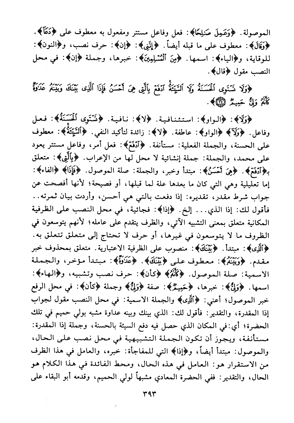 {وَلَا}: {الواو}: استئنافية. {لا}: نافية. {تَسْتَوِي الْحَسَنَةُ}: فعل وفاعل. {وَلَا} {الواو}: عاطفة. {لا}: زائدة لتأكيد النفي. {السَّيِّئَةُ}: معطوف على الحسنة، والجملة الفعلية: مستأنفة. {ادْفَعْ}: فعل أمر، وفاعل مستتر يعود على محمد، والجملة: جملة إنشائية لا محل لها من الإعراب. {بِالَّتِي}: متعلق بـ {ادْفَعْ}. {هِيَ أَحْسَنُ}: مبتدأ وخبر، والجملة: صلة الموصول. {فَإذَا} {الفاء}: إما تعليلية وهي التي كان ما بعدها علة لما قبلها، أو فصيحة؛ لأنها أفصحت عن جواب شرط مقدر، تقديره: إذا دفعت بالتي هي أحسن، وأردت بيان ثمرته .. فأقول لك: إذا الذي ... إلخ. {إذا}: فجائية، في محل النصب على الظرفية المكانية متعلق بمعنى التشبيه الآتي، والظرف يتقدم على عامله؛ لأنهم يتوسعون في الظروف ما لا يتوسعون في غيرها، أو حرف لا تحتاج إلى متعلق تتعلق به. {الَّذِي}: مبتدأ. {بَيْنَكَ}: منصوب على الظرفية الاعتبارية. متعلق بمحذوف خبر مقدم. {وَبَيْنَهُ}: معطوف على {بَيْنَكَ}. {عَدَاوَةٌ}: مبتدأ مؤخر، والجملة الاسمية: صلة الموصول. {كَأَنَّهُ} {كأن}: حرف نصب وتشبيه، و {الهاء}: اسمها. {وَلِيٌّ}: خبرها، {حَمِيمٌ}: صفة {وَلِيٌّ} وجملة {كأن}: في محل الرفع خبر الموصول؛ أعني: {الَّذِي} والجملة الاسمية: في محل النصب مقول لجواب إذا المقدرة، والتقدير؛ فأقول لك: الذي بينك وبينه عداوة مشبه بولي حميم في تلك الحضرة؛ أي: في المكان الذي حصل فيه دفع السيئة بالحسنة، وجملة إذا المقدرة: مستأنفة، ويجوز أن تكون الجملة التشبيهية في محل نصب على الحال، والموصول: مبتدأ أيضًا، و {إذا} التي للمفاجاة: خبره، والعامل في هذا الظرف من الاستقرار هو: العامل في هذه الحال، ومحط الفائدة في هذا الكلام هو الحال، والتقدير: ففي الحضرة المعادي مشبهًا لولي الحميم، وقدمه أبو البقاء على