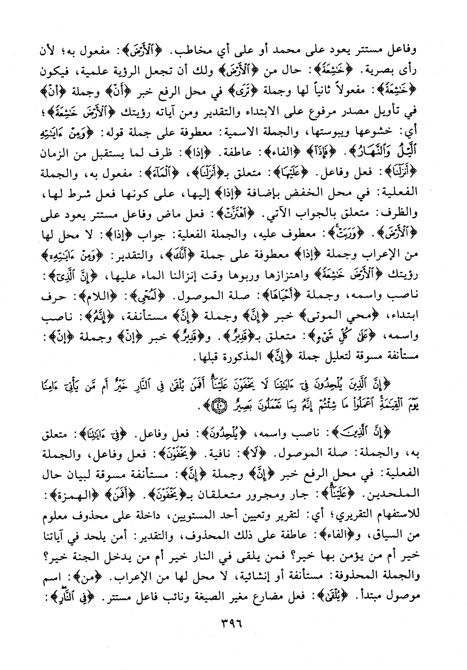 {إِنَّ الَّذِينَ}: ناصب واسمه، {يُلْحِدُونَ}: فعل وفاعل. {فِي آيَاتِنَا}: متعلق به، والجملة: صلة الموصول. {لَا}: نافية. {يَخْفَوْنَ}: فعل وفاعل، والجملة الفعلية: في محل الرفع خبر {أن} وجملة {إِنَّ}: مستأنفة مسوقة لبيان حال الملحدين. {عَلَيْنَا}: جار ومجرور متعلقان بـ {يَخْفَوْنَ}. {أَفَمَنْ} {الهمزة}: للاستفهام التقريري؛ أي: لتقرير وتعيين أحد المستويين، داخلة على محذوف معلوم من السياق، و {الفاء}: عاطفة على ذلك المحذوف، والتقدير: أمن يلحد في آياتنا خير أم من يؤمن بها خير؟ فمن يلقى في النار خير أم من يدخل الجنة خير؟ والجملة المحذوفة: مستأنفة أو إنشائية، لا محل لها من الإعراب. {من}: اسم موصول مبتدأ. {يُلْقَى}: فعل مضارع مغير الصيغة ونائب فاعل مستتر. {فِي النَّارِ}: