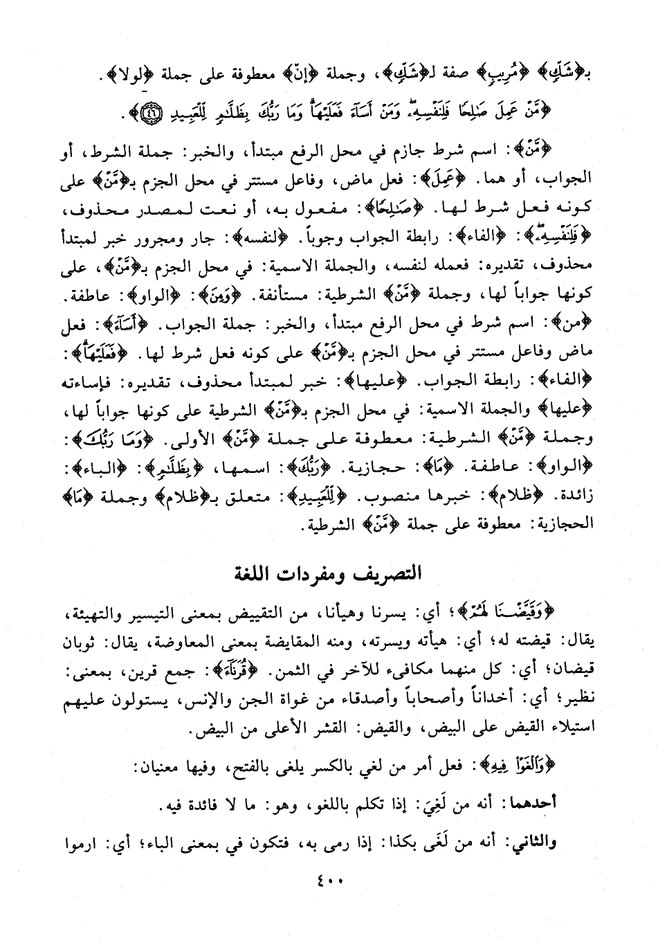 {مَنْ}: اسم شرط جازم في محل الرفع مبتدأ، والخبر: جملة الشرط، أو الجواب، أو هما. {عَمِلَ}: فعل ماض، وفاعل مستتر في محل الجزم بـ {مَنْ} على كونه فعل شرط لها. {صَالِحًا}: مفعول به، أو نعت لمصدر محذوف، {فَلِنَفْسِهِ}: {الفاء}: رابطة الجواب وجوبًا. {لنفسه}: جار ومجرور خبر لمبتدأ محذوف، تقديره: فعمله لنفسه، والجملة الاسمية: في محل الجزم بـ {مَّنْ}، على كونها جوابًا لها، وجملة {مَّنْ} الشرطية: مستأنفة. {ومَنَ}: {الواو}: عاطفة. {من}: اسم شرط في محل الرفع مبتدأ، والخبر: جملة الجواب. {أَسَاءَ}: فعل ماض وفاعل مستتر في محل الجزم بـ {مَّن} على كونه فعل شرط لها. {فَعَلَيْهَا}: {الفاء}: رابطة الجواب. {عليها}: خبر لمبتدأ محذوف، تقديره: فإساءته {عليها} والجملة الاسمية: في محل الجزم بـ {مَّن} الشرطية على كونا جوابًا لها، وجملة {مَّنْ} الشرطية: معطوفة على جملة {مَّنْ} الأولى. {وَمَا رَبُّكَ}: {الواو}: عاطفة. {مَا}: حجازية. {رَبُّكَ}: اسمها، {بِظَلَّامٍ}: {الباء}: زائدة. {ظلام}: خبرها منصوب. {لِلْعَبِيدِ}: متعلق بـ {ظلام} وجملة {مَا} الحجازية: معطوفة على جملة {مَّنْ} الشرطية.