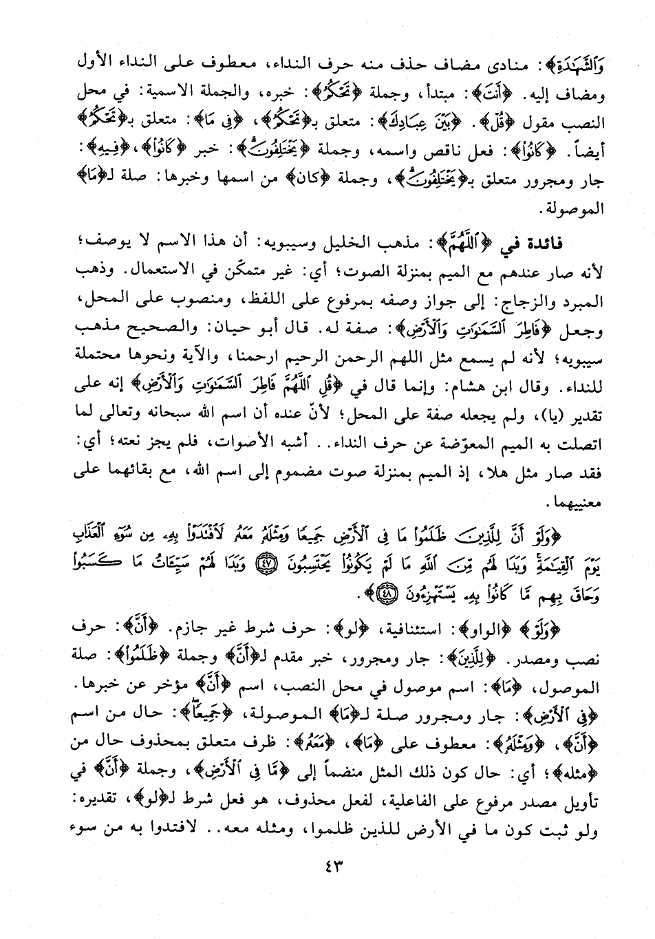 فائدة في {اللَّهُمَّ}: مذهب الخليل وسيبويه: أن هذا الاسم لا يوصف؛ لأنه صار عندهم مع الميم بمنزلة الصوت؛ أي: غير متمكن في الاستعمال. وذهب المبرد والزجاج: إلى جواز وصفه بمرفوع على اللفظ، ومنصوب على المحل، وجعل {فَاطِرَ السَّمَاوَاتِ وَالْأَرْضِ}: صفة له. قال أبو حيان: والصحيح مذهب سيبويه؛ لأنه لم يسمع مثل اللهم الرحمن الرحيم ارحمنا، والآية ونحوها محتملة للنداء. وقال ابن هشام: وإنما قال في {قُلِ اللَّهُمَّ فَاطِرَ السَّمَاوَاتِ وَالْأَرْضِ} إنه على تقدير (يا)، ولم يجعله صفة على المحل؛ لأنّ عنده أن اسم الله سبحانه وتعالى لما اتصلت به الميم المعوضة عن حرف النداء .. أشبه الأصوات، فلم يجز نعته؛ أي: فقد صار مثل هلا، إذ الميم بمنزلة صوت مضموم إلى اسم الله، مع بقائهما على معنييهما.