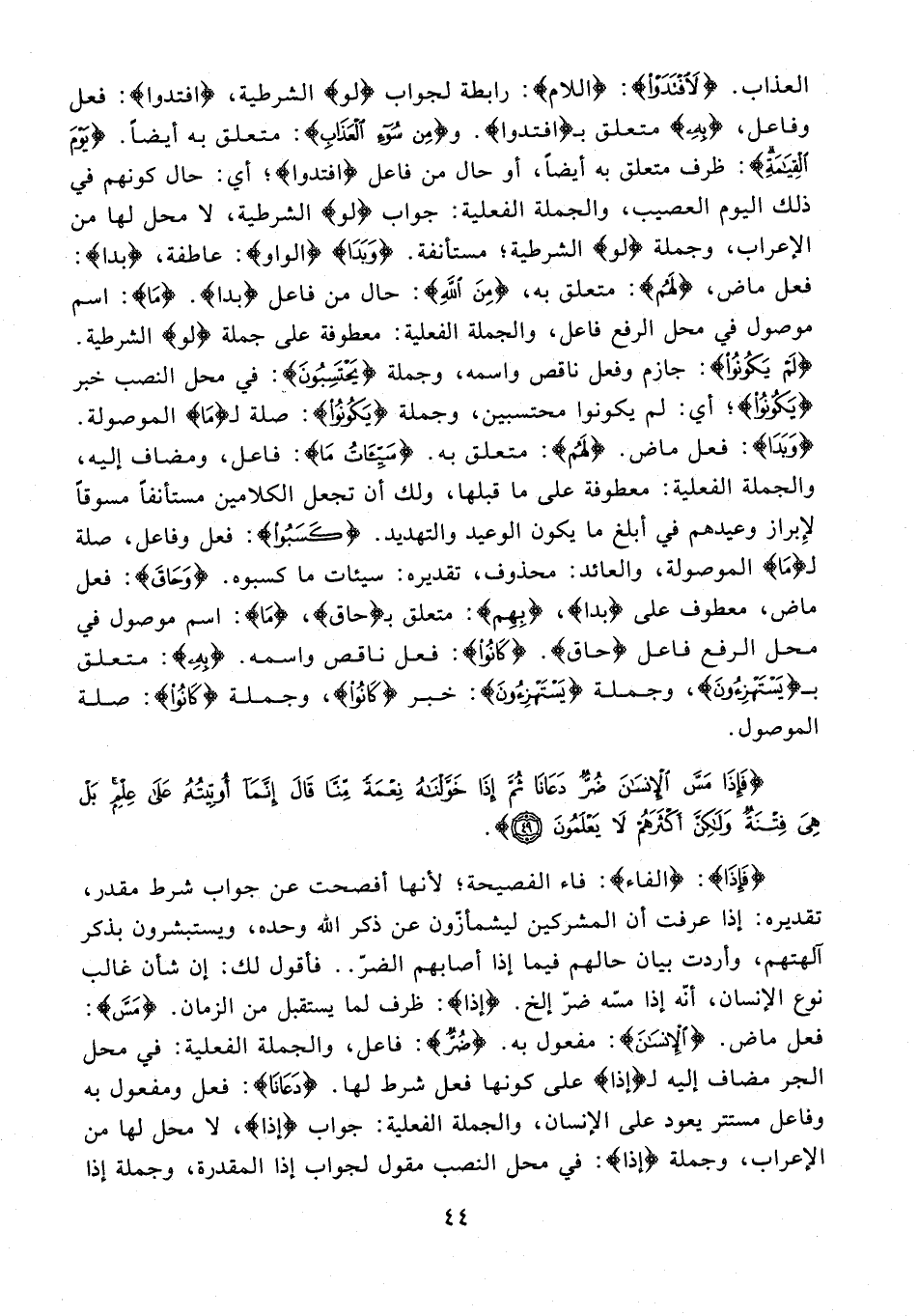 العذاب. {لَافْتَدَوْا}: {اللام}: رابطة لجواب {لَوْ} الشرطية، {افْتَدَوْا}: فعل وفاعل، {بِهِ} متعلق بـ {افْتَدَوْا}. و {مِنْ سُوءِ الْعَذَابِ}: متعلق به أيضًا. {يَوْمَ الْقِيَامَةِ}: ظرف متعلق به أيضًا، أو حال من فاعل {افْتَدَوْا}؛ أي: حال كونهم في ذلك اليوم العصيب، والجملة الفعلية: جواب {لو} الشرطية، لا محل لها من الإعراب، وجملة {لَوْ} الشرطية؛ مستأنفة. {وَبَدَا} {الواو}: عاطفة، {بَدَا}: فعل ماض، {لَهُمْ}: متعلق به، {مِنَ اللَّهِ}: حال من فاعل {بَدَا}. {مَا}: اسم موصول في محل الرفع فاعل، والجملة الفعلية: معطوفة على جملة {لَوْ} الشرطية. {لَمْ يَكُونُوا}: جازم وفعل ناقص واسمه، وجملة {يَحْتَسِبُونَ}: في محل النصب خبر {يَكُونُوا}؛ أي: لم يكونوا محتسبين، وجملة {يَكُونُوا}: صلة لـ {مَا} الموصولة. {بَدَا}: فعل ماض. {لَمْ}: متعلق به. {سَيِّئَاتُ مَا}: فاعل، ومضاف إليه، والجملة الفعلية: معطوفة على ما قبلها، ولك أن تجعل الكلامين مستأنفًا مسوقًا لإِبراز وعيدهم في أبلغ ما يكون الوعيد والتهديد. {كَسَبُوا}: فعل وفاعل، صلة لـ {مَا} الموصولة، والعائد: محذوف، تقديره: سيئات ما كسبوه. {وَحَاقَ}: فعل ماض، معطوف على {بَدَا}، {بِهِمْ}: متعلق بـ {حَاقَ}، {مَا}: اسم موصول في محل الرفع فاعل {وَحَاقَ}. {كَانُوا}: فعل ناقص واسمه. {بِهِ}: متعلق بـ {يَسْتَهْزِئُونَ}، وجملة {يَسْتَهْزِئُونَ}: خبر {كَانُوا}، وجملة {كَانُوا}: صلة الموصول.