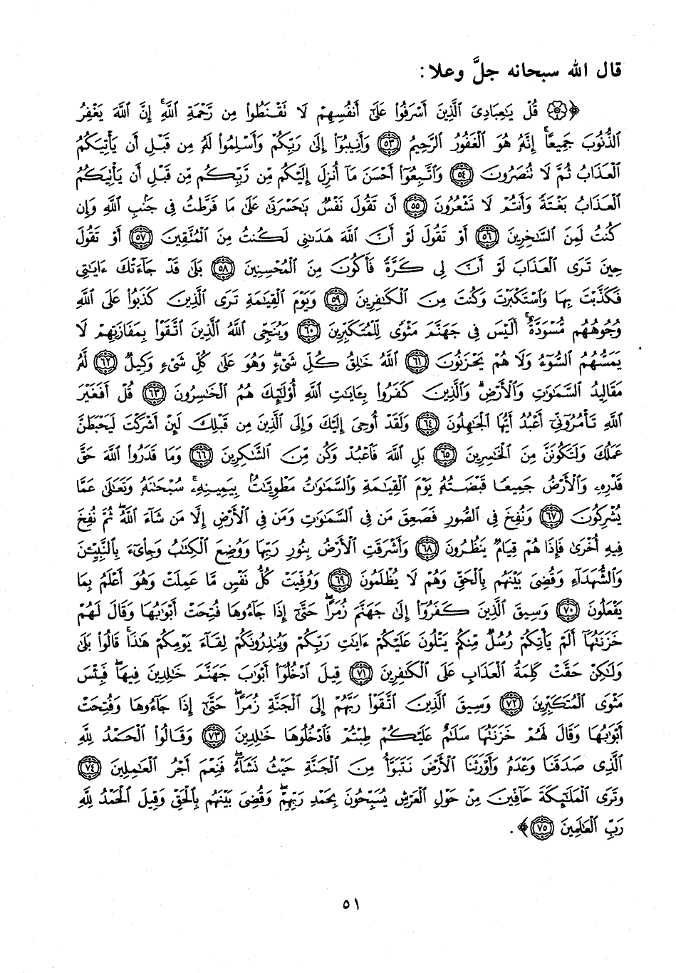 {قُلْ يَا عِبَادِيَ الَّذِينَ أَسْرَفُوا عَلَى أَنْفُسِهِمْ لَا تَقْنَطُوا مِنْ رَحْمَةِ اللَّهِ إِنَّ اللَّهَ يَغْفِرُ الذُّنُوبَ جَمِيعًا إِنَّهُ هُوَ الْغَفُورُ الرَّحِيمُ (53) وَأَنِيبُوا إِلَى رَبِّكُمْ وَأَسْلِمُوا لَهُ مِنْ قَبْلِ أَنْ يَأْتِيَكُمُ الْعَذَابُ ثُمَّ لَا تُنْصَرُونَ (54) وَاتَّبِعُوا أَحْسَنَ مَا أُنْزِلَ إِلَيْكُمْ مِنْ رَبِّكُمْ مِنْ قَبْلِ أَنْ يَأْتِيَكُمُ الْعَذَابُ بَغْتَةً وَأَنْتُمْ لَا تَشْعُرُونَ (55) أَنْ تَقُولَ نَفْسٌ يَا حَسْرَتَا عَلَى مَا فَرَّطْتُ فِي جَنْبِ اللَّهِ وَإِنْ كُنْتُ لَمِنَ السَّاخِرِينَ (56) أَوْ تَقُولَ لَوْ أَنَّ اللَّهَ هَدَانِي لَكُنْتُ مِنَ الْمُتَّقِينَ (57) أَوْ تَقُولَ حِينَ تَرَى الْعَذَابَ لَوْ أَنَّ لِي كَرَّةً فَأَكُونَ مِنَ الْمُحْسِنِينَ (58) بَلَى قَدْ جَاءَتْكَ آيَاتِي فَكَذَّبْتَ بِهَا وَاسْتَكْبَرْتَ وَكُنْتَ مِنَ الْكَافِرِينَ (59) وَيَوْمَ الْقِيَامَةِ تَرَى الَّذِينَ كَذَبُوا عَلَى اللَّهِ وُجُوهُهُمْ مُسْوَدَّةٌ أَلَيْسَ فِي جَهَنَّمَ مَثْوًى لِلْمُتَكَبِّرِينَ (60) وَيُنَجِّي اللَّهُ الَّذِينَ اتَّقَوْا بِمَفَازَتِهِمْ لَا يَمَسُّهُمُ السُّوءُ وَلَا هُمْ يَحْزَنُونَ (61) اللَّهُ خَالِقُ كُلِّ شَيْءٍ وَهُوَ عَلَى كُلِّ شَيْءٍ وَكِيلٌ (62) لَهُ مَقَالِيدُ السَّمَاوَاتِ وَالْأَرْضِ وَالَّذِينَ كَفَرُوا بِآيَاتِ اللَّهِ أُولَئِكَ هُمُ الْخَاسِرُونَ (63) قُلْ أَفَغَيْرَ اللَّهِ تَأْمُرُونِّي أَعْبُدُ أَيُّهَا الْجَاهِلُونَ (64) وَلَقَدْ أُوحِيَ إِلَيْكَ وَإِلَى الَّذِينَ مِنْ قَبْلِكَ لَئِنْ أَشْرَكْتَ لَيَحْبَطَنَّ عَمَلُكَ وَلَتَكُونَنَّ مِنَ الْخَاسِرِينَ (65) بَلِ اللَّهَ فَاعْبُدْ وَكُنْ مِنَ الشَّاكِرِينَ (66) وَمَا قَدَرُوا اللَّهَ حَقَّ قَدْرِهِ وَالْأَرْضُ جَمِيعًا قَبْضَتُهُ يَوْمَ الْقِيَامَةِ وَالسَّمَاوَاتُ مَطْوِيَّاتٌ بِيَمِينِهِ سُبْحَانَهُ وَتَعَالَى عَمَّا يُشْرِكُونَ (67) وَنُفِخَ فِي الصُّورِ فَصَعِقَ مَنْ فِي السَّمَاوَاتِ وَمَنْ فِي الْأَرْضِ إِلَّا مَنْ شَاءَ اللَّهُ ثُمَّ نُفِخَ فِيهِ أُخْرَى فَإِذَا هُمْ قِيَامٌ يَنْظُرُونَ (68) وَأَشْرَقَتِ الْأَرْضُ بِنُورِ رَبِّهَا وَوُضِعَ الْكِتَابُ وَجِيءَ بِالنَّبِيِّينَ وَالشُّهَدَاءِ وَقُضِيَ بَيْنَهُمْ بِالْحَقِّ وَهُمْ لَا يُظْلَمُونَ (69) وَوُفِّيَتْ كُلُّ نَفْسٍ مَا عَمِلَتْ وَهُوَ أَعْلَمُ بِمَا يَفْعَلُونَ (70) وَسِيقَ الَّذِينَ كَفَرُوا إِلَى جَهَنَّمَ زُمَرًا حَتَّى إِذَا جَاءُوهَا فُتِحَتْ أَبْوَابُهَا وَقَالَ لَهُمْ خَزَنَتُهَا أَلَمْ يَأْتِكُمْ رُسُلٌ مِنْكُمْ يَتْلُونَ عَلَيْكُمْ آيَاتِ رَبِّكُمْ وَيُنْذِرُونَكُمْ لِقَاءَ يَوْمِكُمْ هَذَا قَالُوا بَلَى وَلَكِنْ حَقَّتْ كَلِمَةُ الْعَذَابِ عَلَى الْكَافِرِينَ (71) قِيلَ ادْخُلُوا أَبْوَابَ جَهَنَّمَ خَالِدِينَ فِيهَا فَبِئْسَ مَثْوَى الْمُتَكَبِّرِينَ (72) وَسِيقَ الَّذِينَ اتَّقَوْا رَبَّهُمْ إِلَى الْجَنَّةِ زُمَرًا حَتَّى إِذَا جَاءُوهَا وَفُتِحَتْ أَبْوَابُهَا وَقَالَ لَهُمْ خَزَنَتُهَا سَلَامٌ عَلَيْكُمْ طِبْتُمْ فَادْخُلُوهَا خَالِدِينَ (73) وَقَالُوا الْحَمْدُ لِلَّهِ الَّذِي صَدَقَنَا وَعْدَهُ وَأَوْرَثَنَا الْأَرْضَ نَتَبَوَّأُ مِنَ الْجَنَّةِ حَيْثُ نَشَاءُ فَنِعْمَ أَجْرُ الْعَامِلِينَ (74) وَتَرَى الْمَلَائِكَةَ حَافِّينَ مِنْ حَوْلِ الْعَرْشِ يُسَبِّحُونَ بِحَمْدِ رَبِّهِمْ وَقُضِيَ بَيْنَهُمْ بِالْحَقِّ وَقِيلَ الْحَمْدُ لِلَّهِ رَبِّ الْعَالَمِينَ (75)}.
