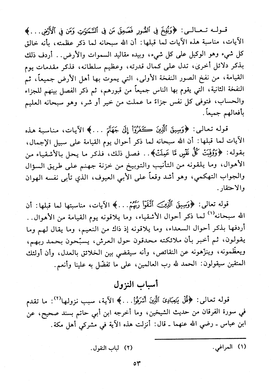قوله تعالى: {قُلْ يَا عِبَادِيَ الَّذِينَ أَسْرَفُوا ...} الآية، سبب نزولها (¬2): ما تقدم في سورة الفرقان من حديث الشيخين، وما أخرجه ابن أبي حاتم بسند صحيح، عن ابن عباس - رضي الله عنهما - قال: أنزلت هذه الآية في مشركي أهل مكة.