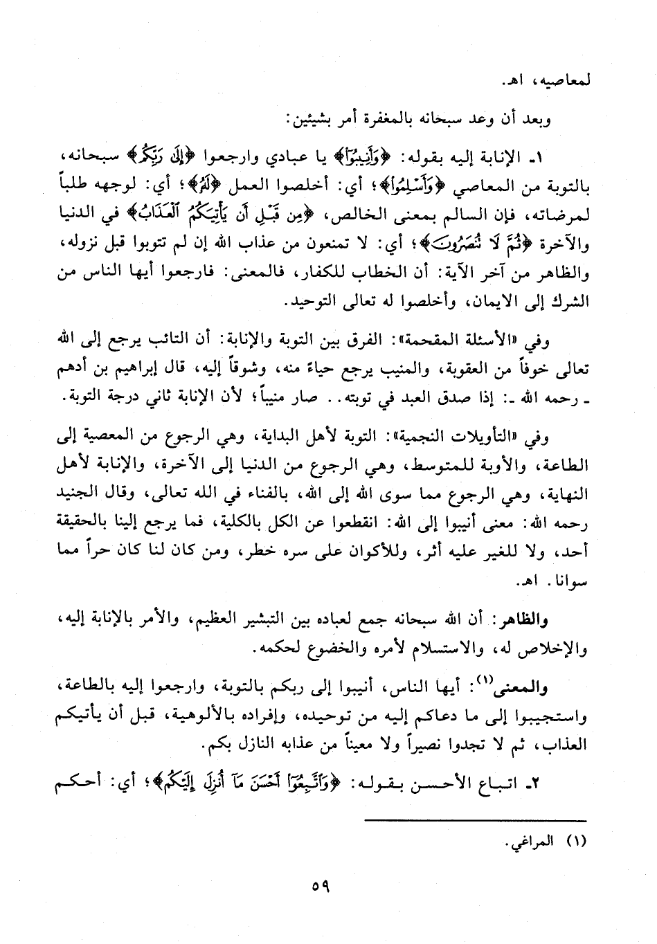 1 - الإنابة إليه بقوله: {وَأَنِيبُوا} يا عبادي وارجعوا {إِلَى رَبِّكُمْ} سبحانه، بالتوبة من المعاصي {وَأَسْلِمُوا}؛ أي: أخلصوا العمل {لَهُ}؛ أي: لوجهه طلبًا لمرضاته، فإن السالم بمعنى الخالص، {مِنْ قَبْلِ أَنْ يَأْتِيَكُمُ الْعَذَابُ} في الدنيا والآخرة {ثُمَّ لَا تُنْصَرُونَ}؛ أي: لا تمنعون من عذاب الله إن لم تتوبوا قبل نزوله، والظاهر من آخر الآية: أن الخطاب للكفار، فالمعنى: فارجعوا أيها الناس من الشرك إلى الإيمان، وأخلصوا له تعالى التوحيد.