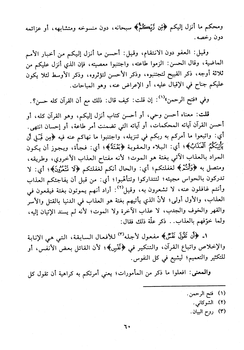 1 - {أَنْ تَقُولَ نَفْسٌ} مفعول لأجله (¬3) للأفعال السابقة، التي هي الإنابة والإخلاص واتباع القرآن، والتنكير في {نَفْسٌ}؛ لأن القائل بعض الأنفس، أو للتكثير والتعميم؛ ليشيع في كل النفوس.
