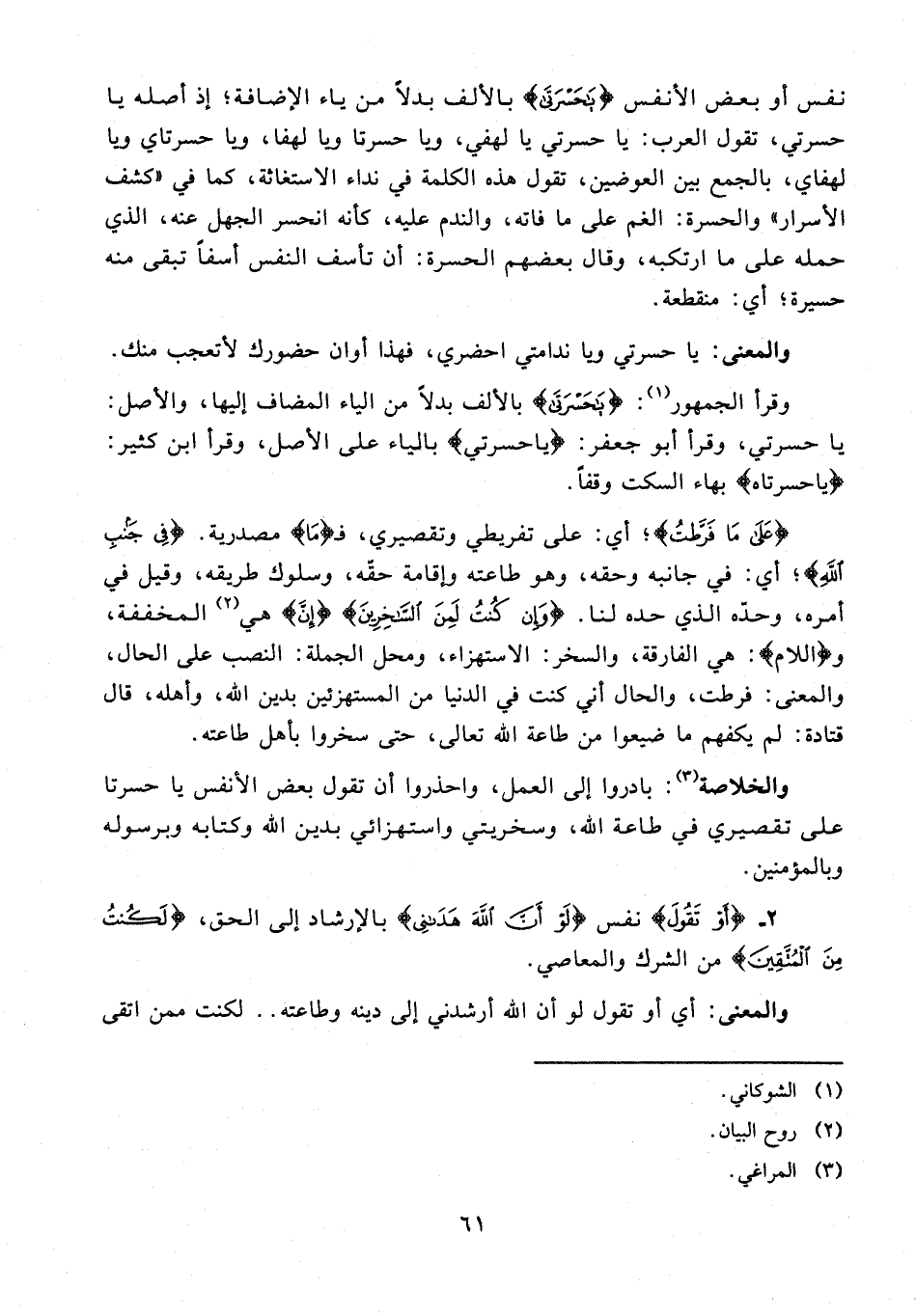 والخلاصة (¬3): بادروا إلى العمل، واحذروا أن تقول بعض الأنفس يا حسرتا على تقصيري في طاعة الله، وسخريتي واستهزائي بدين الله وكتابه وبرسوله وبالمؤمنين.
