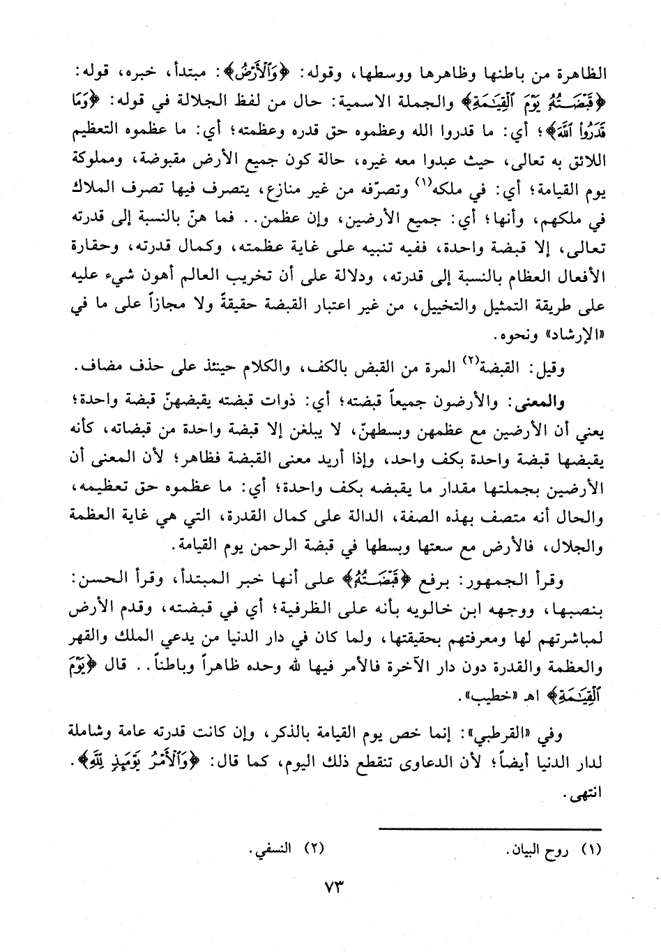 والمعنى: والأرضون جميعًا قبضته؛ أي: ذوات قبضته يقبضهنّ قبضة واحدة؛ يعني أن الأرضين مع عظمهن وبسطهنّ، لا يبلغن إلا قبضة واحدة من قبضاته، كأنه يقبضها قبضة واحدة بكف واحد، وإذا أريد معنى القبضة فظاهر؛ لأن المعنى أن الأرضين بجملتها مقدار ما يقبضه بكف واحدة؛ أي: ما عظموه حق تعظيمه، والحال أنه متصف بهذه الصفة، الدالة على كمال القدرة، التي هي غاية العظمة والجلال، فالأرض مع سعتها وبسطها في قبضة الرحمن يوم القيامة.