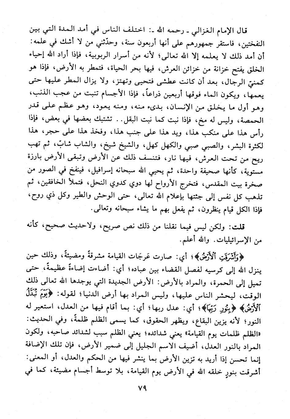 قال الإِمام الغزالي - رحمه الله -: اختلف الناس في أمد المدة التي بين النفختين، فاستقر جمهورهم على أنها أربعون سنة، وحدّثني من لا أشك في علمه: أن أمد ذلك لا يعلمه إلا الله تعالى؛ لأنه من أسرار الربوبية، فإذا أراد الله إحياء الخلق يفتح خزانة من خزائن العرش، فيها بحر الحياة، فتمطر به الأرض، فإذا هو كمنيّ الرجال، بعد أن كانت عطشى فتحيى وتهتز، ولا يزال المطر عليها حتى يعمها، ويكون الماء فوقها أربعين ذراعًا، فإذا الأجسام تنبت من عجيب الذنب، وهو أول ما يخلق من الإنسان، بدىء منه، ومنه يعود، وهو عظم على قدر الحمصة، وليس له مخ، فإذا نبت كما نبت البقل .. تشتبك بعضها في بعض، فإذا رأس هذا على منكب هذا، ويد هذا على جنب هذا، وفخذ هذا على حجر، هذا لكثرة البشر، والصبي صبي والكهل كهل، والشيخ شيخ، والشاب شابّ، ثم تهب ريح من تحت العرش، فيها نار، فتنسف ذلك عن الأرض وتبقى الأرض بارزة مستوية، كأنها صحيفة واحدة، ثم يحيي الله سبحانه إسرافيل، فينفخ في الصور من صخرة بيت المقدس، فتخرج الأرواح لها دوي كدوي النحل، فتملأ الخافقين، ثم تذهب كل نفس إلى جثتها بإعلام الله تعالى، حتى الوحش والطير وكل ذي روح، فإذا الكل قيام ينظرون، ثم يفعل بهم ما يشاء سبحانه وتعالى.