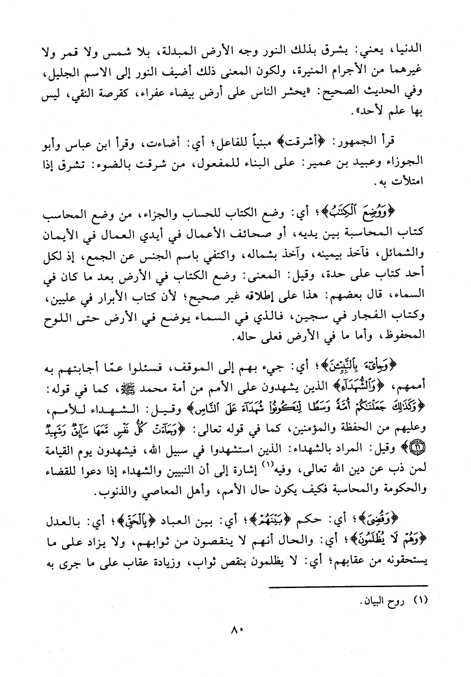 الدنيا، يعني: يشرق بذلك النور وجه الأرض المبدلة، بلا شمس ولا قمر ولا غيرهما من الأجرام المنيرة، ولكون المعنى ذلك أضيف النور إلى الاسم الجليل، وفي الحديث الصحيح: "يحشر الناس على أرض بيضاء عفراء، كقرصة النقي، ليس بها علم أحد".