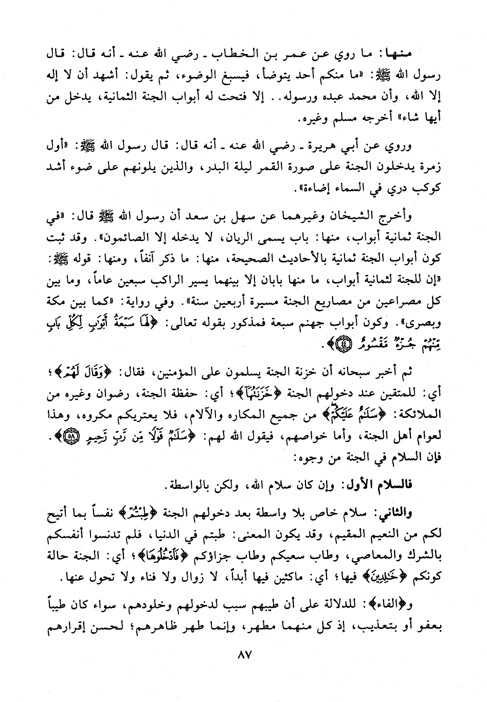 وأخرج الشيخان وغيرهما عن سهل بن سعد أن رسول الله - صلى الله عليه وسلم - قال: "في الجنة ثمانية أبواب، منها: باب يسمى الريان، لا يدخله إلا الصائمون". وقد ثبت كون أبواب الجنة ثمانية بالأحاديث الصحيحة، منها: ما ذكر آنفًا، ومنها: قوله - صلى الله عليه وسلم -: "إن للجنة لثمانية أبواب، ما منها بابان إلا بينهما يسير الراكب سبعين عامًا، وما بين كل مصراعين من مصاريع الجنة مسيرة أربعين سنة". وفي رواية: "كما بين مكة وبصرى". وكون أبواب جهنم سبعة فمذكور بقوله تعالى: {لَهَا سَبْعَةُ أَبْوَابٍ لِكُلِّ بَابٍ مِنْهُمْ جُزْءٌ مَقْسُومٌ (44)}.