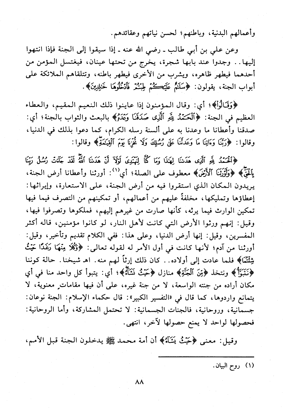 74 - {وَقَالُوا}؛ أي: وقال المؤمنون إذا عاينوا ذلك النعيم المقيم، والعطاء العظيم في الجنة: {الْحَمْدُ لِلَّهِ الَّذِي صَدَقَنَا وَعْدَهُ} بالبعث والثواب بالجنة؛ أي: صدقنا وأعطانا ما وعدنا به على ألسنة رسله الكرام، كما دعوا بذلك في الدنيا، وقالوا: {رَبَّنَا وَآتِنَا مَا وَعَدْتَنَا عَلَى رُسُلِكَ وَلَا تُخْزِنَا يَوْمَ الْقِيَامَةِ} وقالوا: {الْحَمْدُ لِلَّهِ الَّذِي هَدَانَا لِهَذَا وَمَا كُنَّا لِنَهْتَدِيَ لَوْلَا أَنْ هَدَانَا اللَّهُ لَقَدْ جَاءَتْ رُسُلُ رَبِّنَا بِالْحَقِّ} {وَأَوْرَثَنَا الْأَرْضَ} معطوف على الصلة؛ أي (¬1): أورثنا وأعطانا أرض الجنة، يريدون المكان الذي استقروا فيه من أرض الجنة، على الاستعارة، وإيراثها: إعطاؤها وتمليكها، مخلفةً عليهم من أعمالهم، أو تمكينهم من التصرف فيما فيها تمكين الوارث فيما يرثه، كأنها صارت من غيرهم إليهم، فملكوها وتصرفوا فيها، وقيل: إنهم ورثوا الأرض التي كانت لأهل النار، لو كانوا مؤمنين، قاله أكثر المفسرين، وقيل: إنها أرض الدنيا، وعلى هذا: ففي الكلام تقديم وتأخير، وقيل: أورثنا من آدم؛ لأنها كانت في أول الأمر له لقوله تعالى: {وَكُلَا مِنْهَا رَغَدًا حَيْثُ شِئْتُمَا} فلما عادت إلى أولاده .. كان ذلك إرثًا لهم منه. اهـ شيخنا. حالة كوننا {نَتَبَوَّأُ} ونتخذ {مِنَ الْجَنَّةِ} منازل {حَيْثُ نَشَاءُ}؛ أي: يتبوأ كل واحد منا في أي مكان أراده من جنته الواسعة، لا من جنة غيره، على أن فيها مقاماتٍ معنوية، لا يتمانع واردوها، كما قال في "التفسير الكبير": قال حكماء الإِسلام: الجنة نوعان: جسمانية، وروحانية، فالجنات الجسمانية: لا تحتمل المشاركة، وأما الروحانية: فحصولها لواحد لا يمنع حصولها لآخر، انتهى.