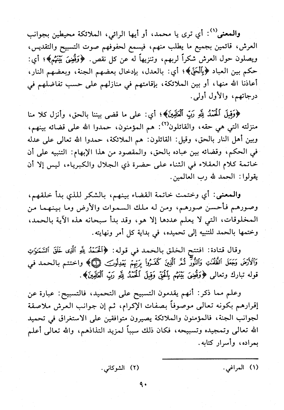 والمعنى (¬1): أي ترى يا محمد، أو أيها الرائي، الملائكة محيطين بجوانب العرش، قائمين بجميع ما يطلب منهم، فيسمع لحفوفهم صوت التسبيح والتقديس، ويصلون حول العرش شكرًا لربهم، وتنزيهًا له عن كل نقص. {وَقُضِيَ بَيْنَهُمْ}؛ أي: حكم بين العباد {بِالْحَقِّ}؛ أي: بالعدل، بإدخال بعضهم الجنة، وبعضهم النار، أعاذنا الله منها، أو بين الملائكة، بإقامتهم في منازلهم على حسب تفاضلهم في درجاتهم، والأول أولى.