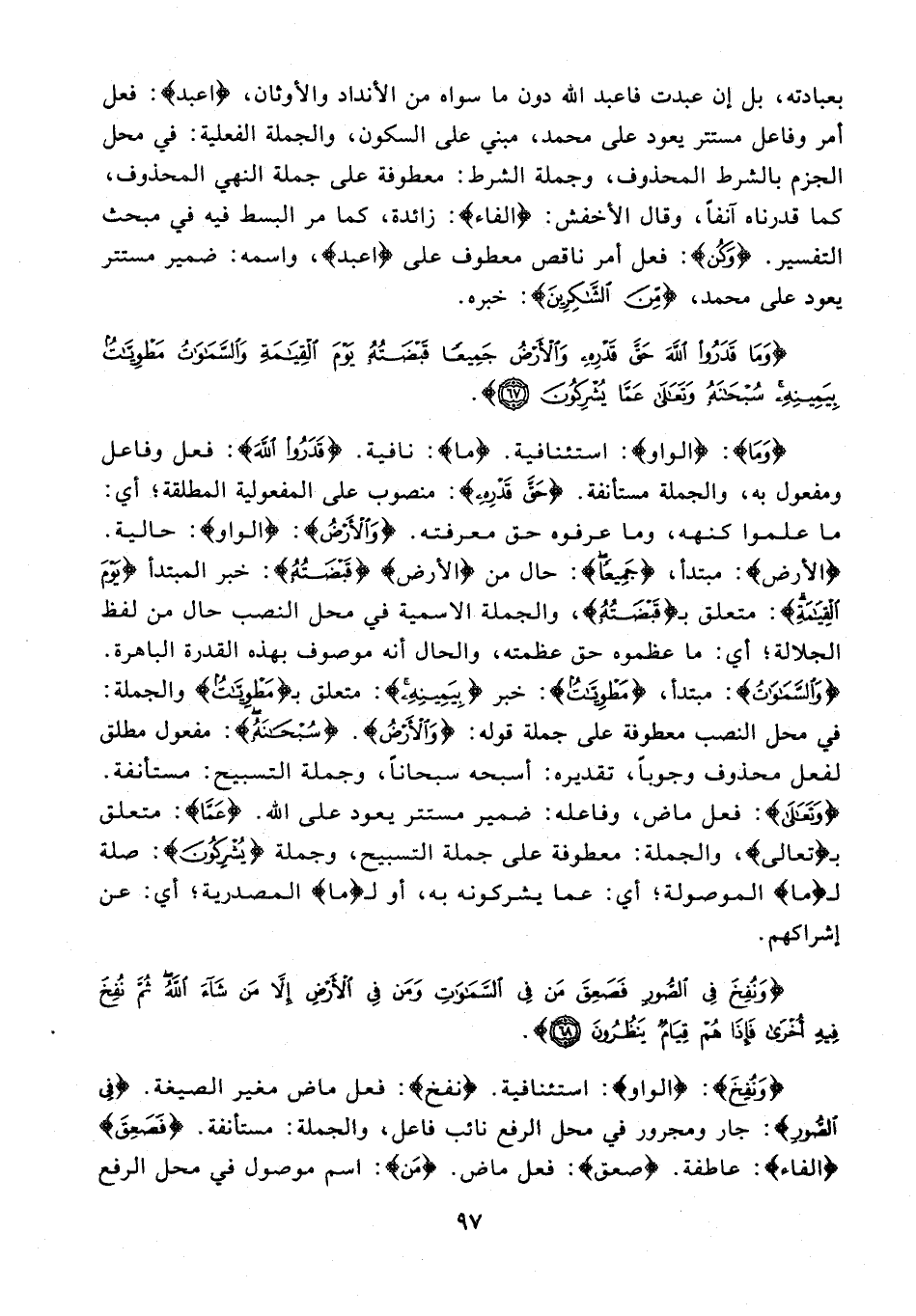 {وَمَا}: {الواو}: استئنافية. {ما}: نافية. {قَدَرُوا اللَّهَ}: فعل وفاعل ومفعول به، والجملة مستأنفة. {حَقَّ قَدْرِهِ}: منصوب على المفعولية المطلقة؛ أي: ما علموا كنهه، وما عرفوه حق معرفته. {وَالْأَرْضُ}: {الواو}: حالية. {الْأَرْضُ}: مبتدأ، {جَمِيعًا}: حال من {الْأَرْضُ} {قَبْضَتُهُ}: خبر المبتدأ {يَوْمَ الْقِيَامَةِ}: متعلق بـ {قَبْضَتُهُ}، والجملة الاسمية في محل النصب حال من لفظ الجلالة؛ أي: ما عظموه حق عظمته، والحال أنه موصوف بهذه القدرة الباهرة. {وَالسَّمَاوَاتُ}: مبتدأ، {مَطْوِيَّاتٌ}: خبر {بِيَمِينِهِ}: متعلق بـ {مَطْوِيَّاتٌ} والجملة: في محل النصب معطوفة على جملة قوله: {وَالْأَرْضُ}. {سُبْحَانَهُ}: مفعول مطلق لفعل محذوف وجوبًا، تقديره: أسبحه سبحانًا، وجملة التسبيح: مستأنفة. {وَتَعَالَى}: فعل ماض، وفاعله: ضمير مستتر يعود على الله. {عَمَّا}: متعلق بـ {تَعَالَى}، والجملة: معطوفة على جملة التسبيح، وجملة {يُشْرِكُونَ}: صلة لـ {ما} الموصولة؛ أي: عما يشركونه به، أو لـ {ما} المصدرية؛ أي: عن إشراكهم.