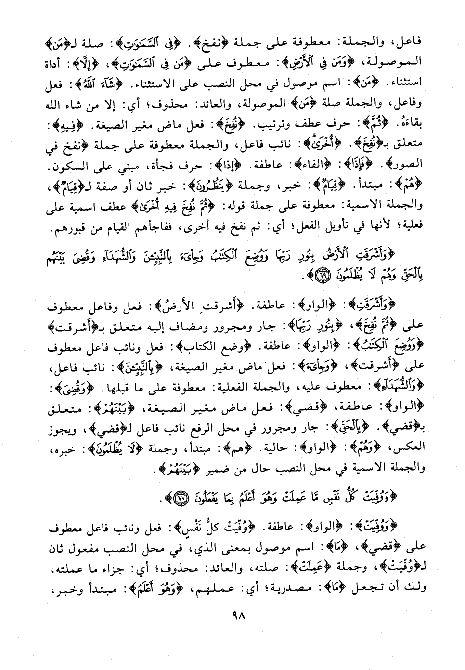 {وَأَشْرَقَتِ}: {الواو}: عاطفة. {أَشْرَقَتِ الْأَرْضُ}: فعل وفاعل معطوف على {ثُمَّ نُفِخَ}، {بِنُورِ رَبِّهَا}: جار ومجرور ومضاف إليه متعلق بـ {أَشرقت} {وَوُضِعَ الْكِتَابُ}: {الواو}: عاطفة. {وُضِعَ الْكِتَابُ}: فعل ونائب فاعل معطوف على {أَشْرَقَتِ}، {وَجِيءَ}: فعل ماض مغير الصيغة، {بِالنَّبِيِّينَ}: نائب فاعل، {وَالشُّهَدَاءِ}: معطوف عليه، والجملة الفعلية: معطوفة على ما قبلها. {وَقُضِيَ}: {الواو}: عاطفة، {قضي}: فعل ماض مغير الصيغة، {بَيْنَهُمْ}: متعلق بـ {قضي}. {بِالْحَقِّ}: جار ومجرور في محل الرفع نائب فاعل لـ {قُضِيَ}، ويجوز العكس، {وَهُمْ}: {الواو}: حالية. {هم}: مبتدأ، وجملة {لَا يُظْلَمُونَ}: خبره، والجملة الاسمية في محل النصب حال من ضمير {بَيْنَهُمْ}.