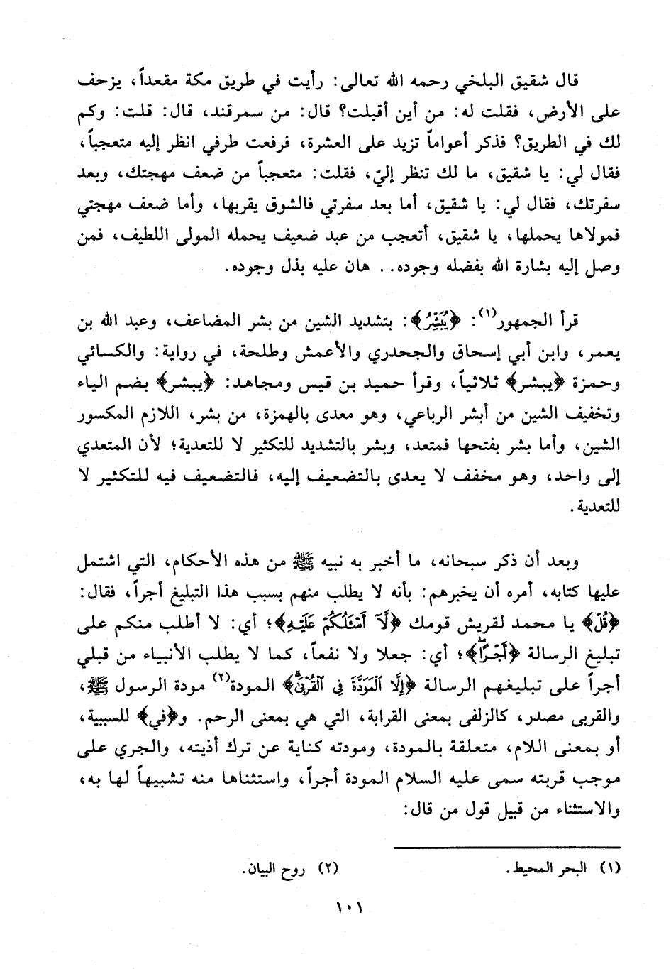 قرأ الجمهور (¬1): {يُبَشِّرُ}: بتشديد الشين من بشر المضاعف، وعبد الله بن يعمر، وابن أبي إسحاق والجحدري والأعمش وطلحة، في رواية: والكسائي وحمزة {يبشر} ثلاثيًا، وقرأ حميد بن قيس ومجاهد: {يبشر} بضم الياء وتخفيف الشين من أبشر الرباعي، وهو معدى بالهمزة، من بشر، اللازم المكسور الشين، وأما بشر بفتحها فمتعد، وبشر بالتشديد للتكثير لا للتعدية؛ لأن المتعدي إلى واحد، وهو مخفف لا يعلى بالتضعيف إليه، فالتضعيف فيه للتكثير لا للتعدية.