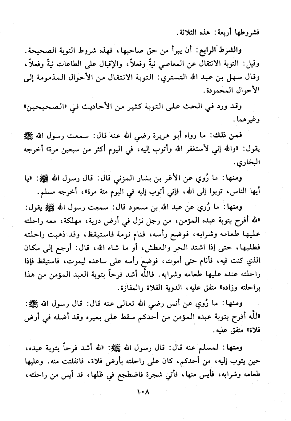 ومنها: لمسلم عنه قال: قال رسول الله - صلى الله عليه وسلم -: "لله أشد فرحًا بتوبة عبده، حين يتوب إليه، من أحدكم، كان على راحلته بأرض فلاة، فانفلتت منه. وعليها طعامه وشرابه، فأيس منها، فأتي شجرة فاضطجع في ظلها، قد أيس من راحلته،