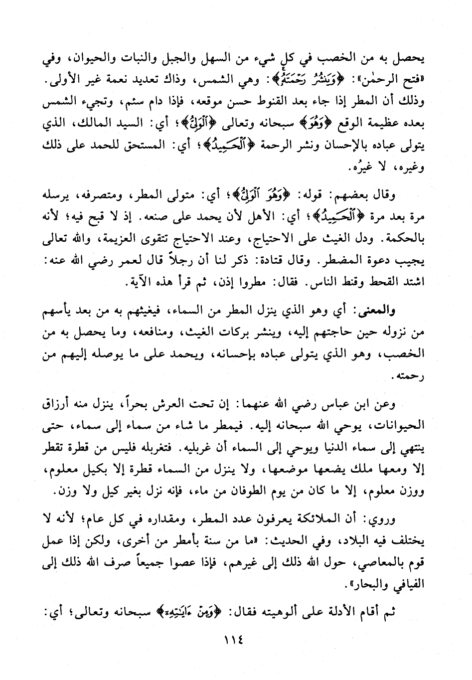 وعن ابن عباس رضي الله عنهما: إن تحت العرش بحرًا، ينزل منه أرزاق الحيوانات، يوحي الله سبحانه إليه. فيمطر ما شاء من سماء إلى سماء، حتى ينتهي إلى سماء الدنيا ويوحي إلى السماء أن غربليه. فتغربله فليس من قطرة تقطر إلا ومعها ملك يضعها موضعها, ولا ينزل من السماء قطرة إلا بكيل معلوم، ووزن معلوم، إلا ما كان من يوم الطوفان من ماء، فإنه نزل بغير قيل ولا وزن.