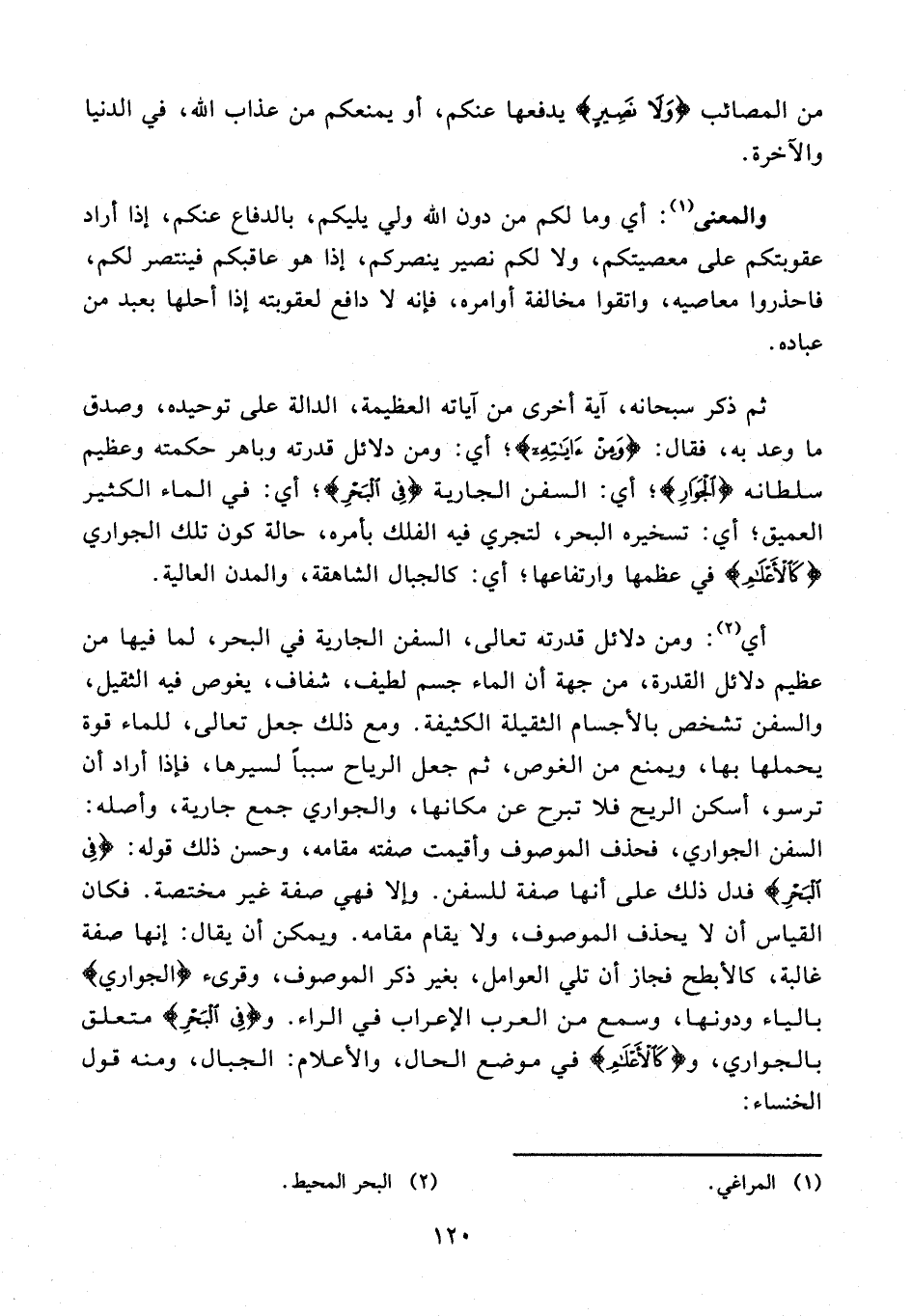 أي (¬2): ومن دلائل قدرته تعالى، السفن الجارية في البحر، لما فيها من عظيم دلائل القدرة، من جهة أن الماء جسم لطيف، شفاف، يغوص فيه الثقيل، والسفن تشخص بالأجسام الثقيلة الكثيفة. ومع ذلك جعل تعالى، للماء قوة يحملها بها، ويمنع من الغوص، ثم جعل الرياح سببًا لسيرها، فإذا أراد أن ترسو، أسكن الريح فلا تبرح عن مكانها، والجواري جمع جارية، وأصله: السفن الجواري، فحذف الموصوف وأقيمت صفته مقامه، وحسن ذلك قوله: {فِي الْبَحْرِ} فدل ذلك على أنها صفة للسفن. وإلا فهي صفة غير مختصة. فكان القياس أن لا يحذف الموصوف، ولا يقام مقامه. ويمكن أن يقال: إنها صفة غالبة، كالأبطح فجاز أن تلي العوامل، بغير ذكر الموصوف، وقرىء {الجواري} بالياء ودونها، وسمع من العرب الإعراب في الراء. و {فِي الْبَحْرِ} متعلق بالجواري، و {كَالْأَعْلَامِ} في موضع الحال، والأعلام: الجبال، ومنه قول الخنساء: