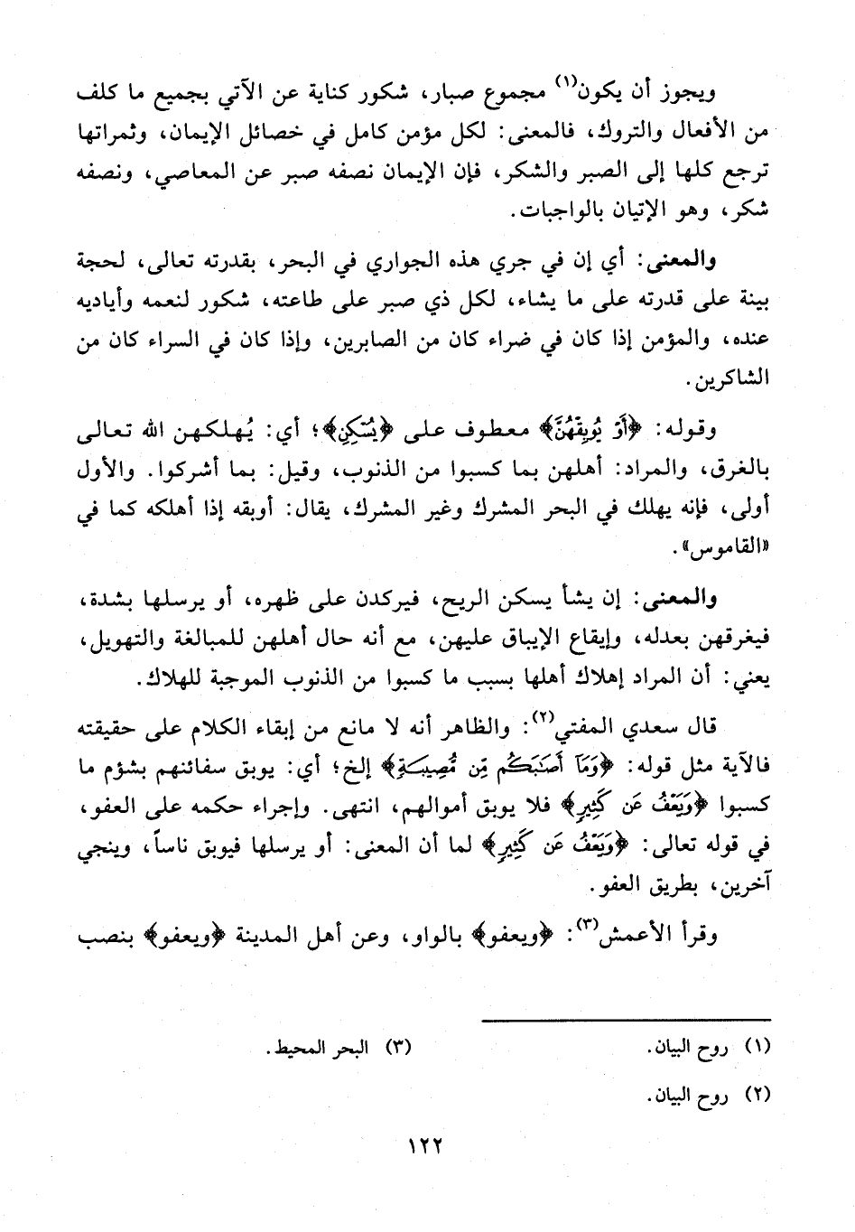 قال سعدي المفتي (¬2): والظاهر أنه لا مانع من إبقاء الكلام على حقيقته فالآية مثل قوله: {وَمَا أَصَابَكُمْ مِنْ مُصِيبَةٍ} إلخ؛ أي: يوبق سفائنهم بشؤم ما كسبوا {وَيَعْفُو عَنْ كَثِيرٍ} فلا يوبق أموالهم، انتهى. وإجراء حكمه على العفو، في قوله تعالى: {وَيَعْفُو عَنْ كَثِيرٍ} لما أن المعنى: أو يرسلها فيوبق ناسًا، وينجي آخرين، بطريق العفو.