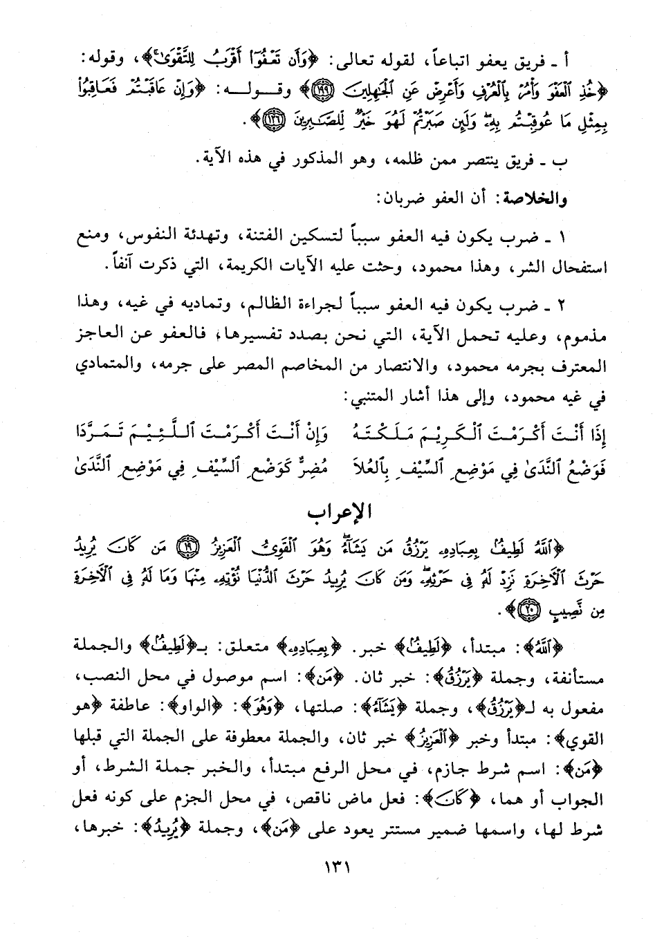 2 - ضرب يكون فيه العفو سببًا لجراءة الظالم، وتماديه في غيه، وهذا مذموم، وعليه تحمل الآية، التي نحن بصدد تفسيرها، فالعفو عن العاجز المعترف بجرمه محمود، والانتصار من المخاصم العصر على جرمه، والمتمادي في غيه محمود، وإلى هذا أشار المتنبي: