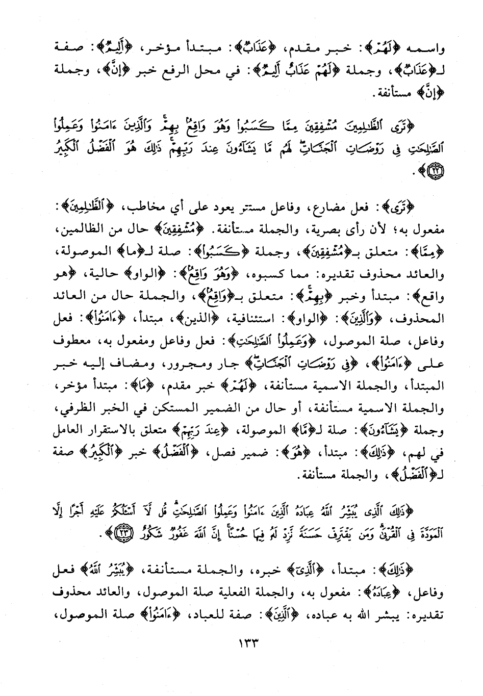 {تَرَى}: فعل مضارع، وفاعل مستتر يعود على أي مخاطب، {الظَّالِمِينَ}: مفعول به؛ لأن رأى بصرية، والجملة مستأنفة. {مُشْفِقِينَ} حال من الظالمين، {مِمَّا}: متعلق بـ {مُشْفِقِينَ}، وجملة {كَسَبُوا}: صلة لـ {ما} الموصولة، والعائد محذوف تقديره: مما كسبوه، {وَهُوَ وَاقِعٌ}: {الواو} حالية، {هو واقع}: مبتدأ وخبر {بِهِمْ}: متعلق بـ {وَاقِعٌ}، والجملة حال من العائد المحذوف، {وَالَّذِينَ}: {الواو}: استئنافية، {الذين}، مبتدأ، {آمَنُوا}: فعل وفاعل، صلة الموصول، {وَعَمِلُوا الصَّالِحَاتِ}: فعل وفاعل ومفعول به، معطوف على {آمَنُوا}، {رَوْضَاتِ الْجَنَّاتِ} جار ومجرور، ومضاف إليه خبر المبتدأ، والجملة الاسمية مستأنفة، {لَهُمْ} خبر مقدم، {مَا}: مبتدأ مؤخر، والجملة الاسمية مستأنفة، أو حال من الضمير المستكن في الخبر الظرفي، وجملة {يَشَاءُونَ}: صلة لـ {مَا} الموصولة، {عِنْدَ رَبِّهِمْ} متعلق بالاستقرار العامل فأنهم، {ذَلِكَ}: مبتدأ، {هُوَ}: ضمير فصل، {الْفَضْلُ} خبر {الْكَبِيرُ} صفة لـ {الْفَضْلُ}، والجملة مستأنفة.